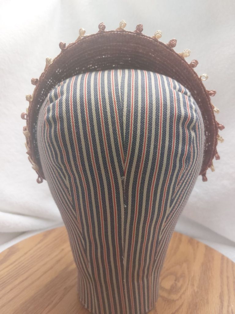 I edged this bonnet first with plain plait, then with a fancy, two-tone decorative braid worked on a “loom” recently made for me. I really like the look.