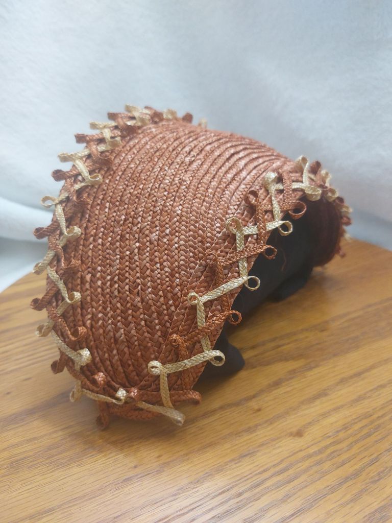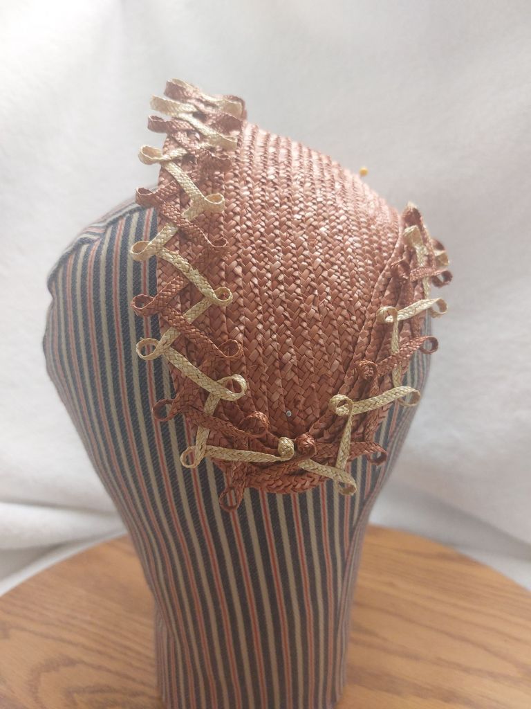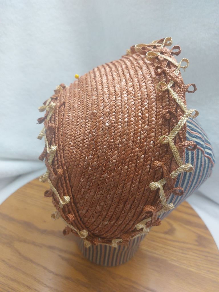 Driving into work the other morning, I was thinking about late 1860s hats when it occurred to me I hadn’t tried the late 1860s fanchon since acquiring the mid-1860s bonnet blocks. These bonnets, sometimes called “half bonnets” in museum collections, have been something of an enigma since I started working with straw. They are an odd, sorta two-sided, sorta three-sided shape that cups the back top of the head. In straw, they are often this base shape, or a variation of this base shape, with a plain plait or decorative plait wrapping around the edge. It is entirely possible, more likely probable, that many of these were cut down from straw bonnets of previous seasons as the styles shrunk.