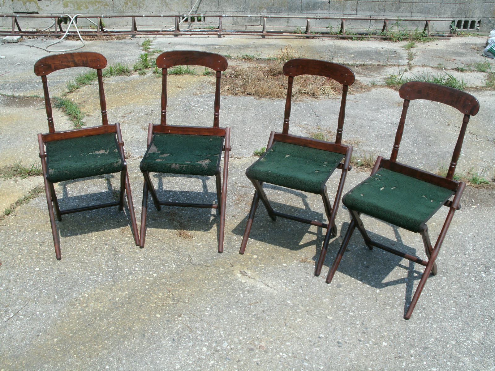 I stumbled onto your blog trying to find information on a set of folding chairs I recently came into possession of (image: http://3.bp.blogspot.com/-uYFmdh2dMPw/TiRoYYj1MeI/AAAAAAAAAKw/QMShWzsLyDM/s1600/Purchases+July+16+2011+002.JPG). As a Civil War reenactor, I bought these to use in camp, but I wanted some historical information to go along with them. All I can tell you about them is that they were purchased from a flea market in Springfield, Ohio. The seller had rescued them out of a basement. I haven’t found any labels or stamps that might indicate a manufacturer. I can confirm that they have been refinished, and I am uncertain if the carpet seats on them are original.