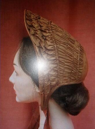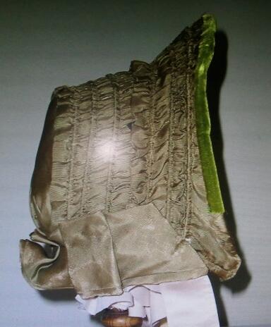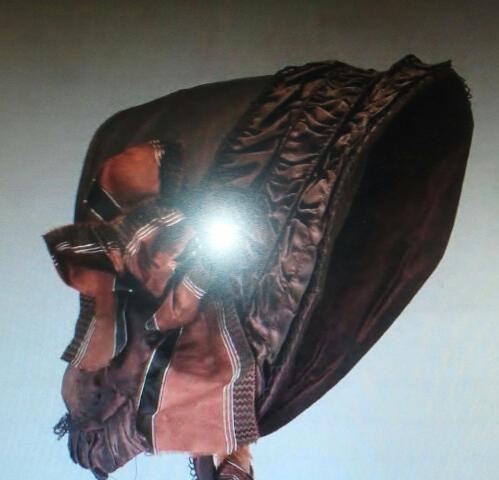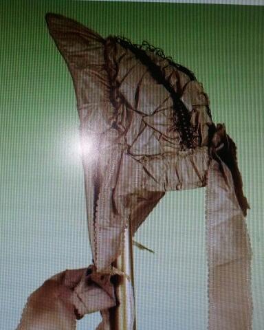 In this fashion illustration and description, the bonnet is directly referred to as “drawn”. This bonnet would have the crepe gathered on cane or wires passing over the bonnet. This bonnet could have been made with two drawn sections, one for the brim and one for the crown.