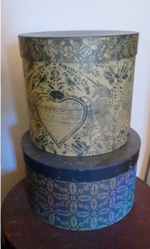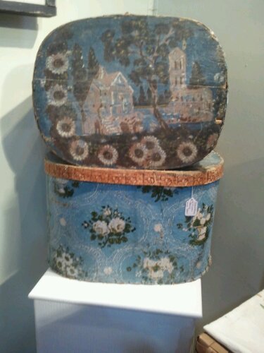 I almost forgot. I wanted to say something about size. Looking at the oval and ovalesque boxes used for millinery, most offered at auction or on museum sites: The lengths seem to range from 15″ to 22″ with 18″ being the most frequent. The widths seem to range from 12″ to 18″ with the width proportionately increasing with the length. The depths or heights seem to range from 8″ to 15″ with more landing between 10″ and 14″. Of course there are larger and smaller bandboxes. There seem to be a good number of extant boxes just smaller than those I grouped. Just looking at images with notes, I can not say what their particular use was.