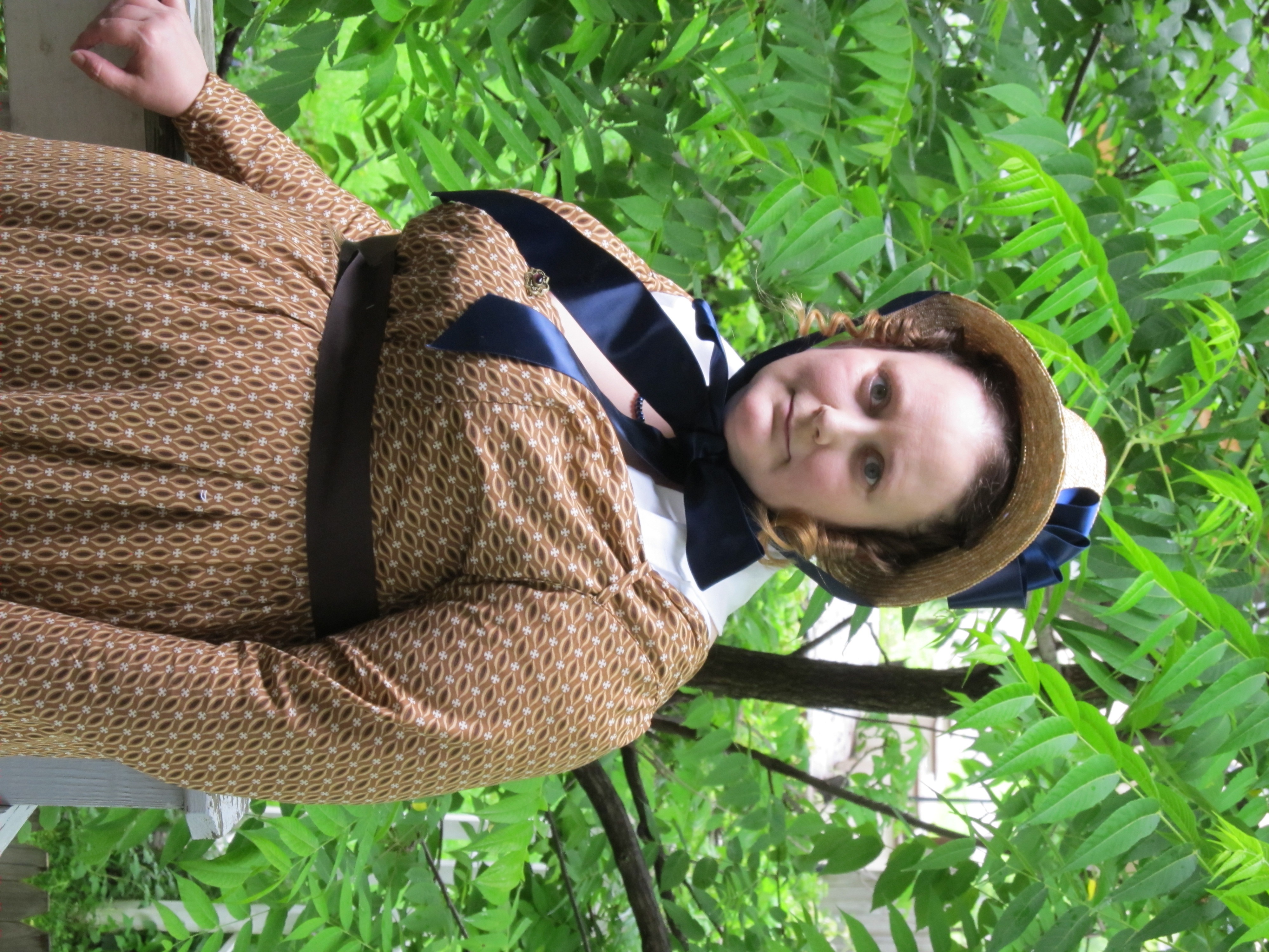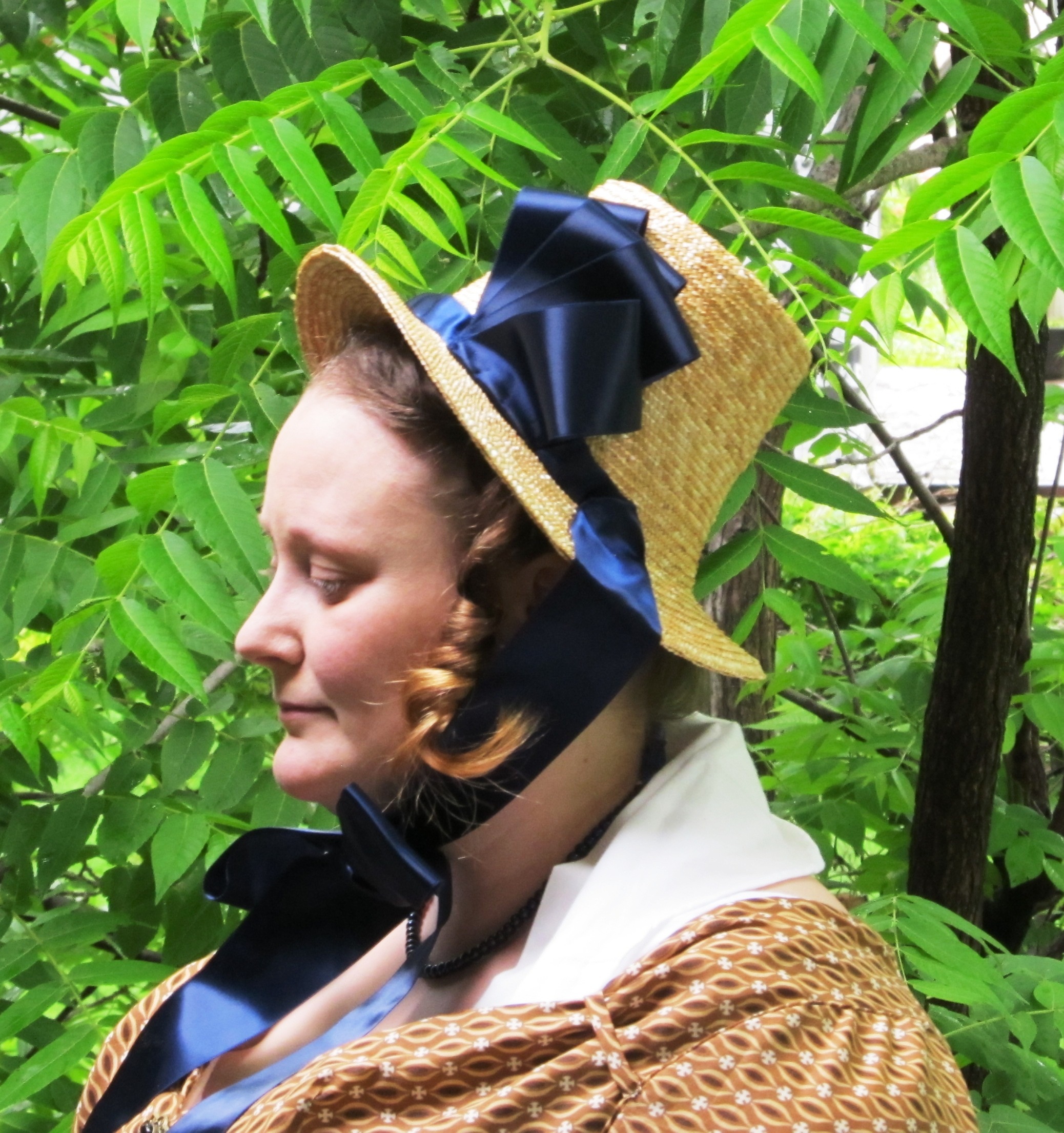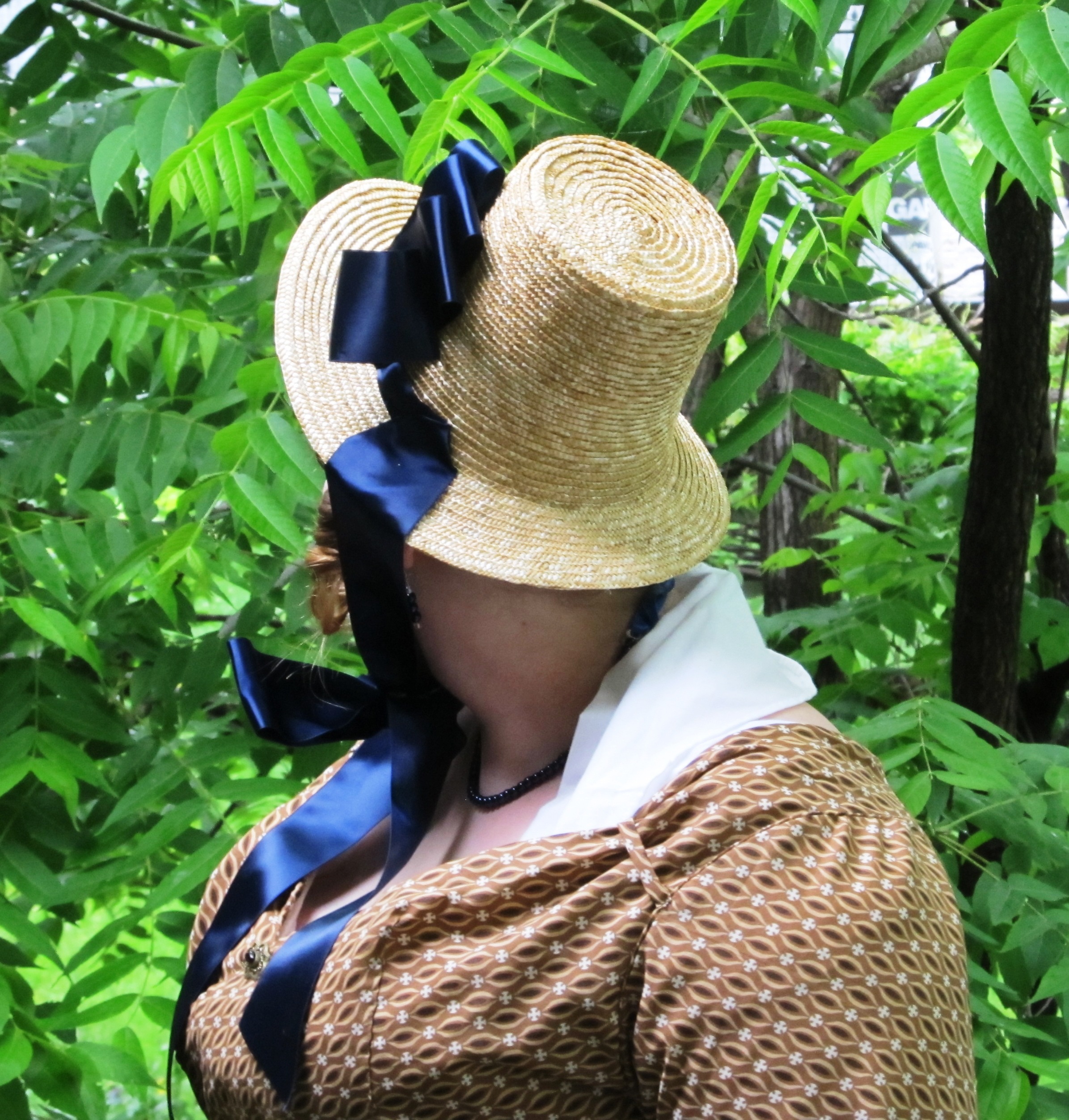 Hello Anna! You looked absolutely lovely on Saturday!! (I saw you in passing on the square.) I am in love with your new dress & refashioned bonnet – browns and blues are one of the best color combinations out there!