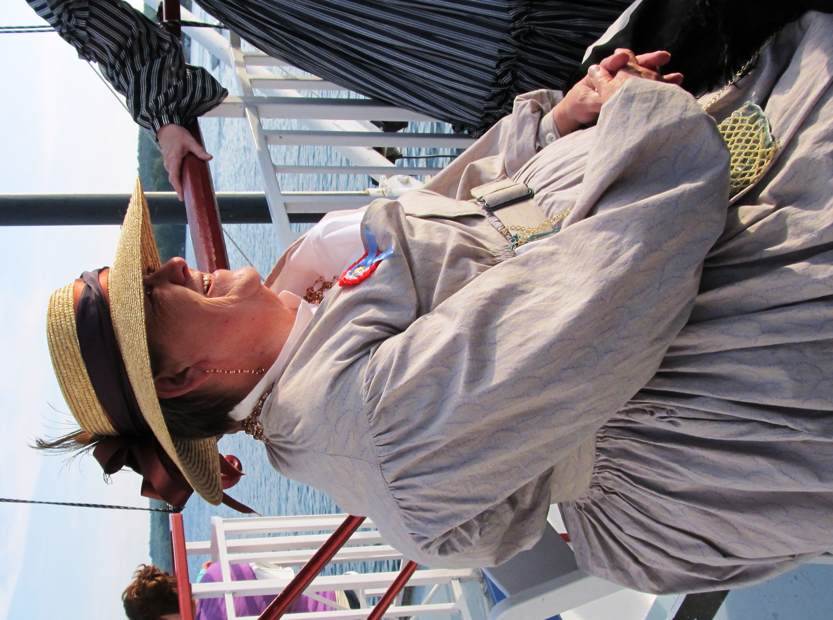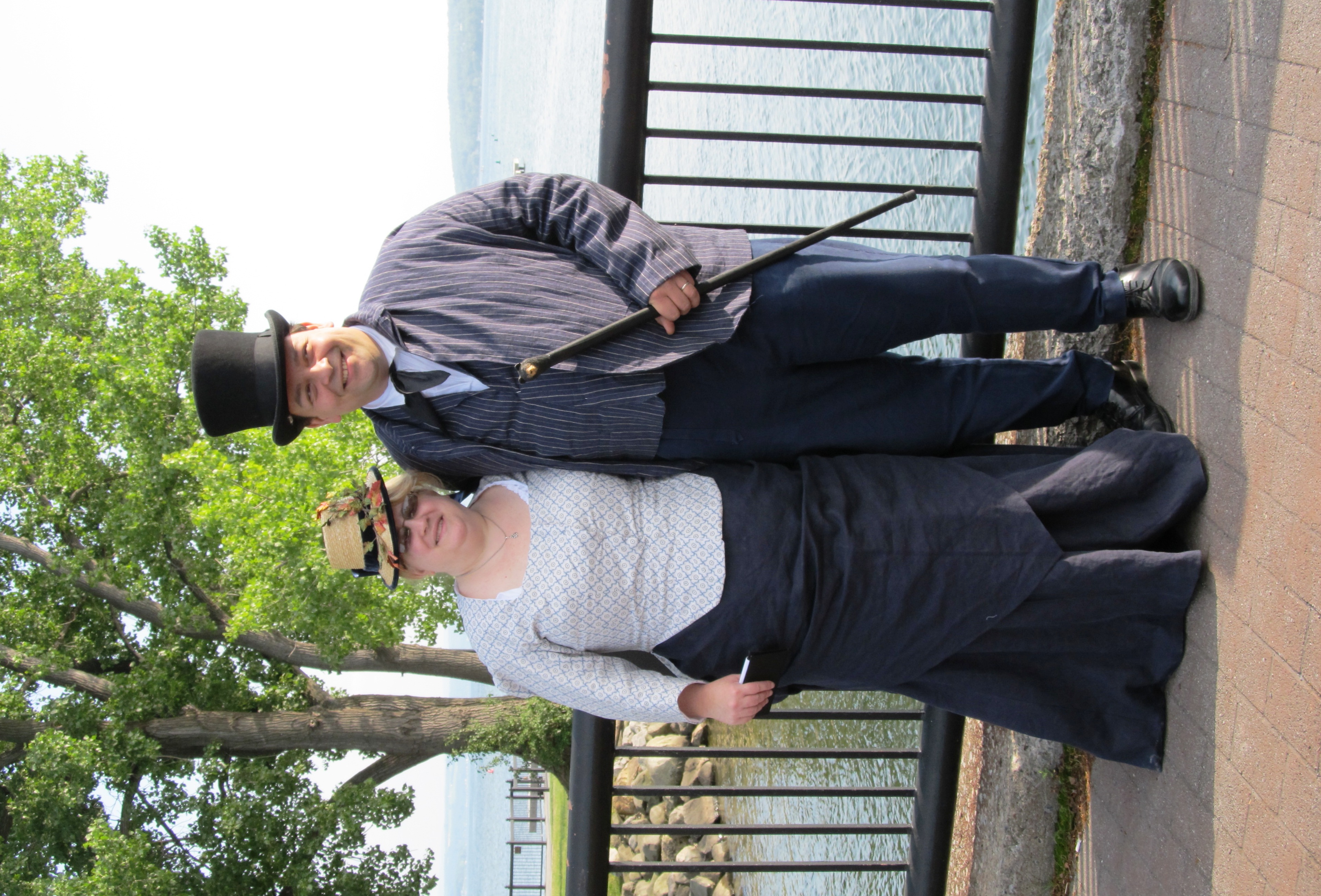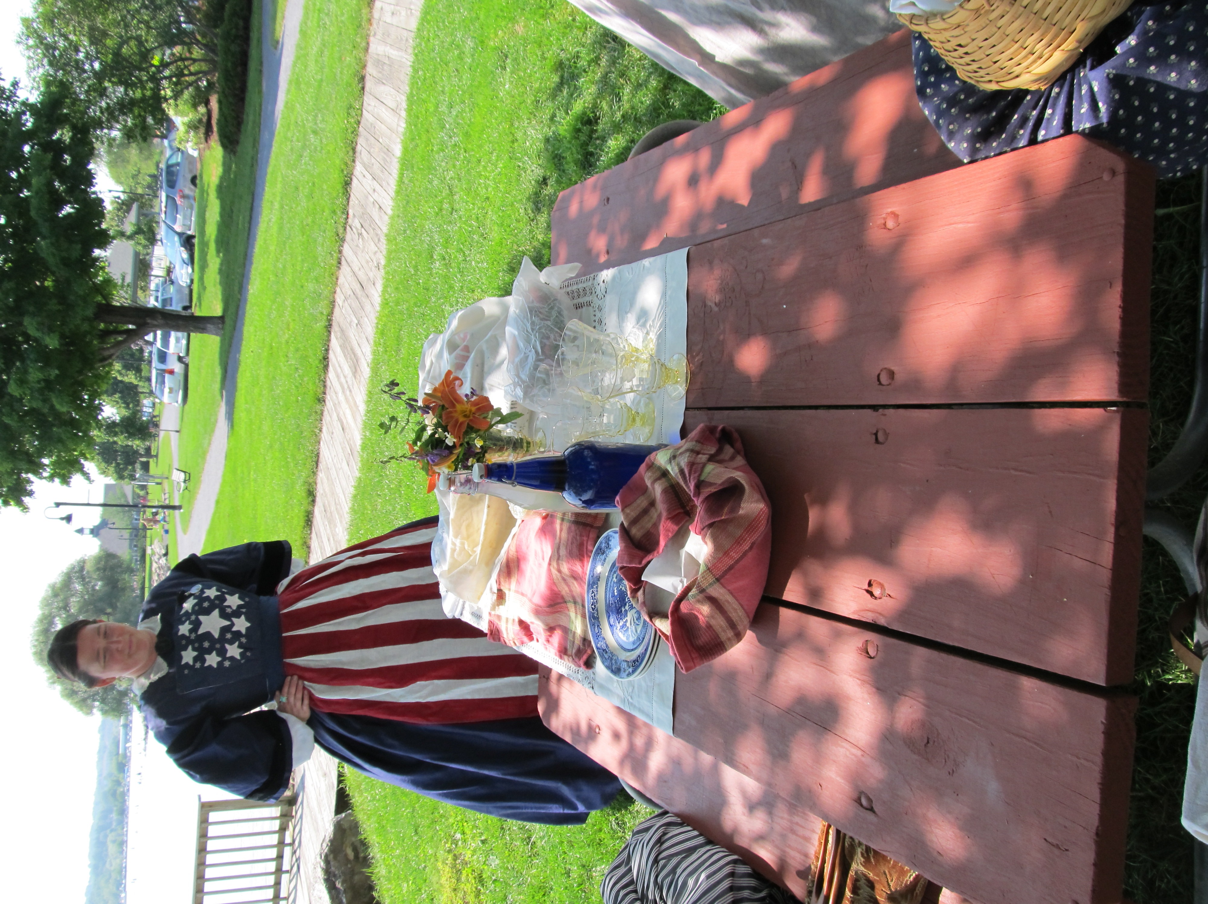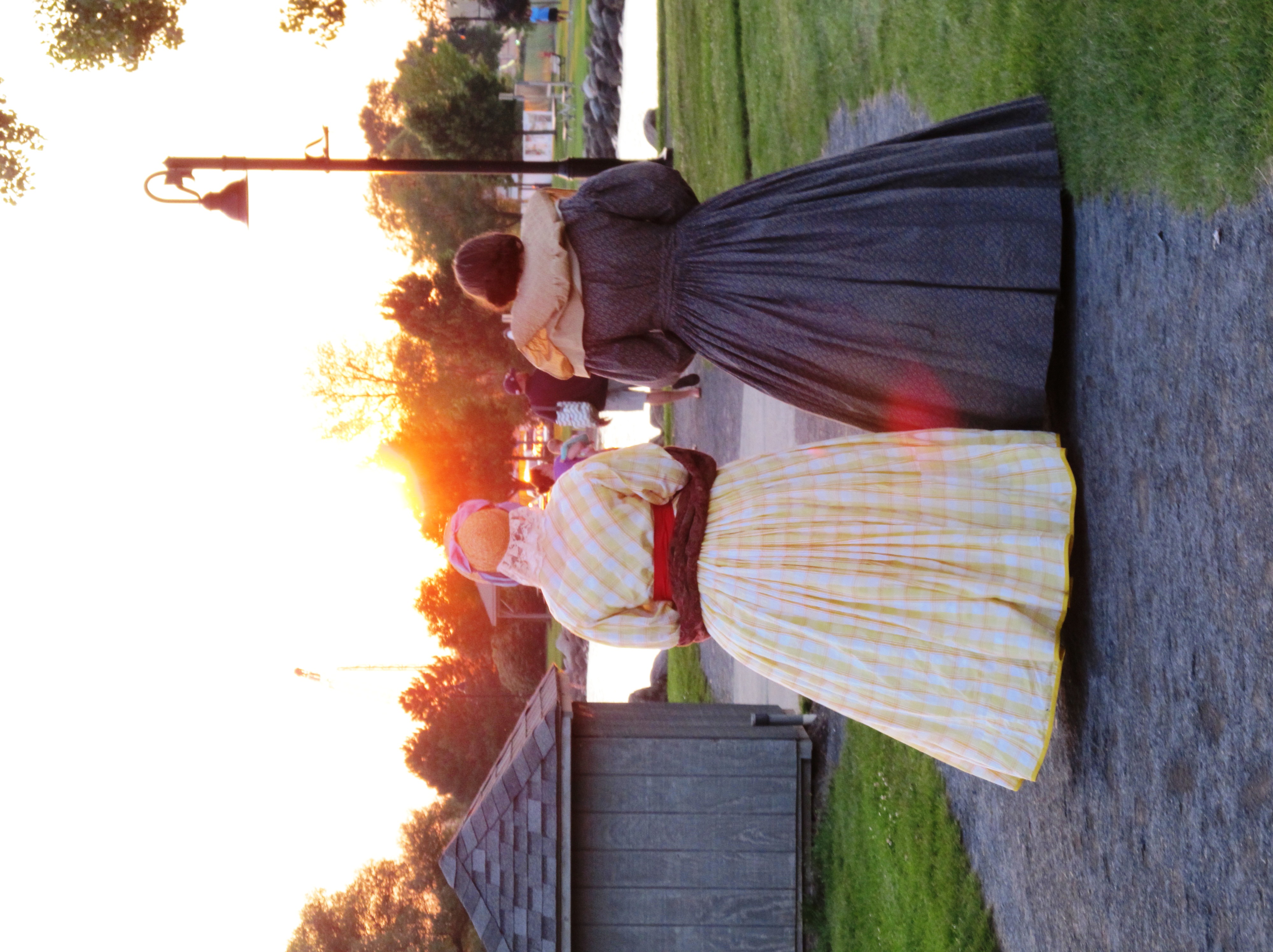 We started our afternoon off with a little picnic in the park near the landing. I packed a small repast of Spanish cheeses (very tasty, no clue what their name are at the moment), bread, strawberries, tarts and lemon water. I was quite convinced that Jody, Trish and Max’s picnic basket was bottomless. These ladies put together an amazing repast. There were potatoes, cheeses, sausage, chicken, eggs, berries and tarts. Max made this period cheese recipe with mace and port in it. It was incredibly tasty. (I’m hoping she will share where that recipe is.) Jody did a tasty twist on lemonade with mint and lavender. The lavender really set it off. I will be stealing that idea.