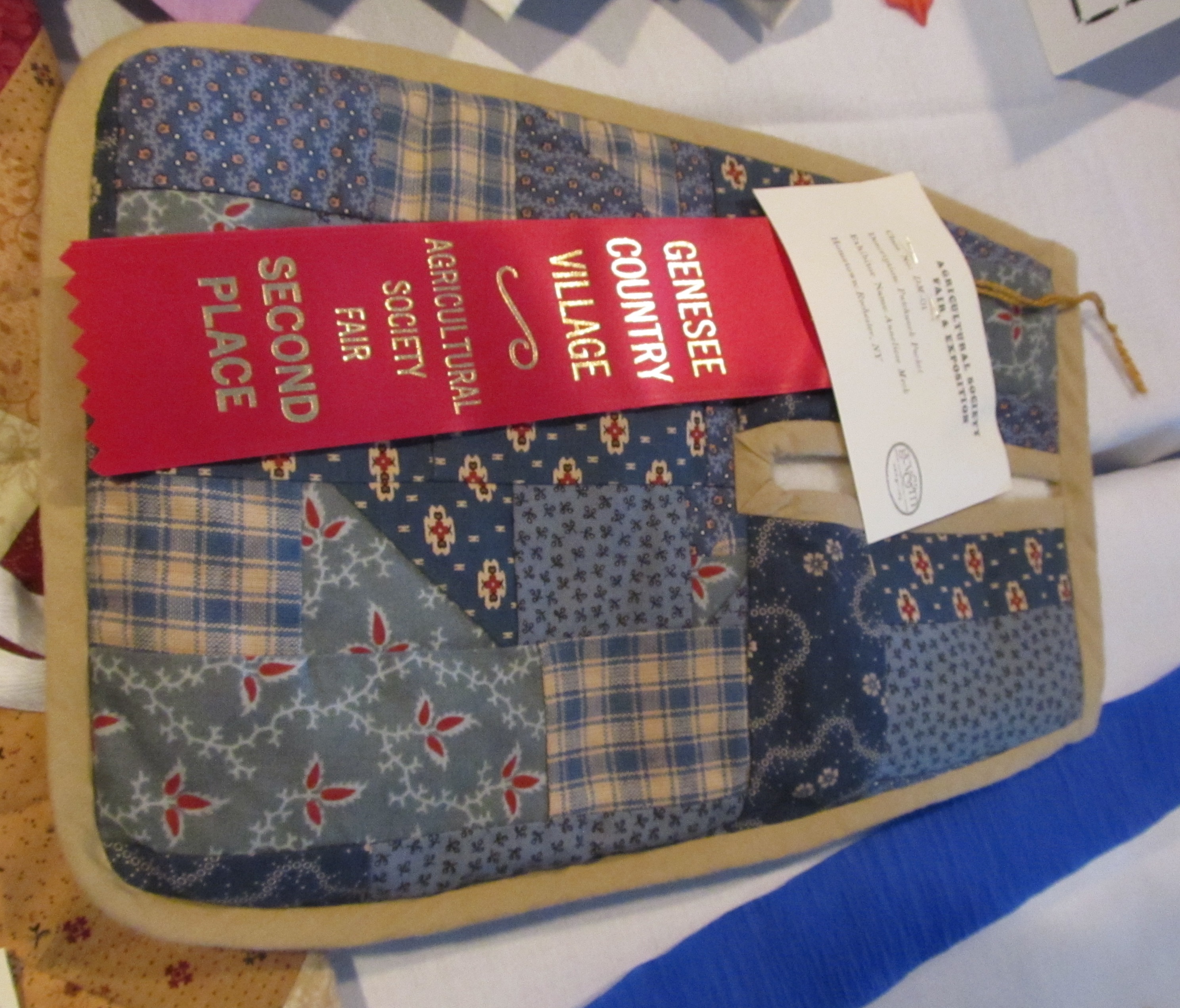 There were a pair of pockets that made me really glad I did not enter a pocket this year. (I had been thinking about doing a doll’s pocket.) One was a lovely patchwork. The other a stunning embroidery. Both in beautiful shades of blue that I am rather partial to.