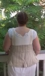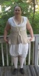 I was generally pleased with the comfort and the look. My worries were looking as fat as I am, not having the right lines, and the weight of my layers sitting on my shoulders. I was confident in the fit that I would not have pressure on my abdomen or rubbing on my waist holes. After two days, I found the weight on my shoulders was not an issue at all. Somehow I felt my petticoats and skirt less even though the wool skirt weighs much more than my sheer skirts. I was basically pleased with the lines. I don’t know how fat I looked. But, I don’t hate the one photo I have of full length me.