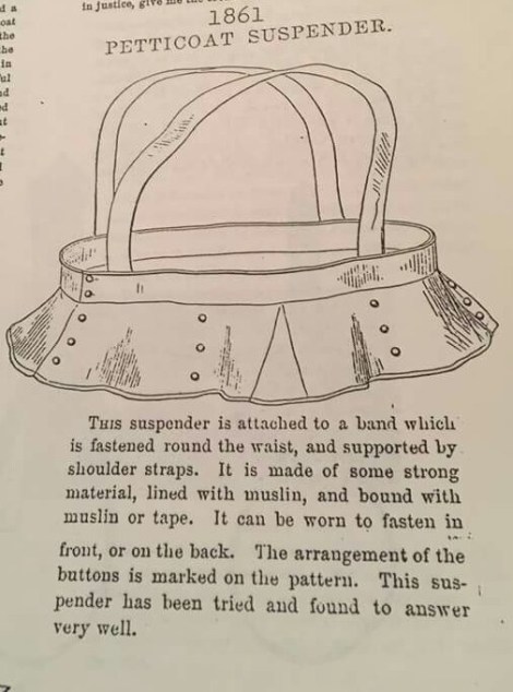 The buttons hold the petticoats and skirt. The illustration showed sets of three buttons in, I think, six placements. Those are shown on the skirt section. Given I had the waist band set much higher, I placed the buttons higher where the skirt attached to the band. I used I 5 sets of 2 buttons set just off of center front, just in front of the sides and center back. M y petticoats* each got 5 loops in the top edge of the waistband in the corresponding places.