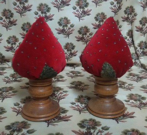 I made my strawberries of cotton velvet, stuffed with wool a top wooden stands, and beaded with antique clear glass beads that are silvery at the centers. They stand 5″ tall.