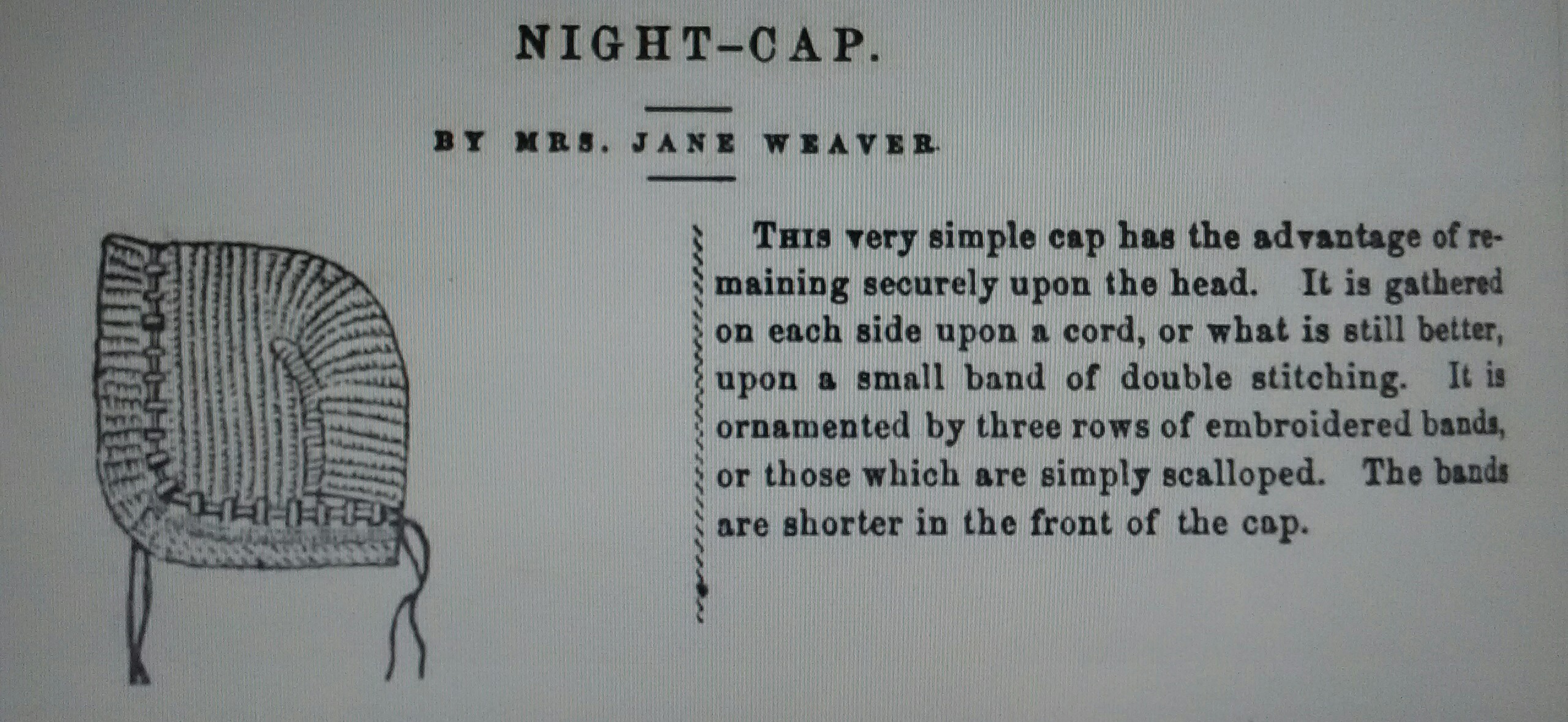 The directions for most caps seem to be written with the assumption that night caps are so common place that readers already know how to make them in their sleep. Well, that is a bit of a challenge for us a century and a half later. Ladies periodicals show night-caps that are sewn, crochet, and knit.