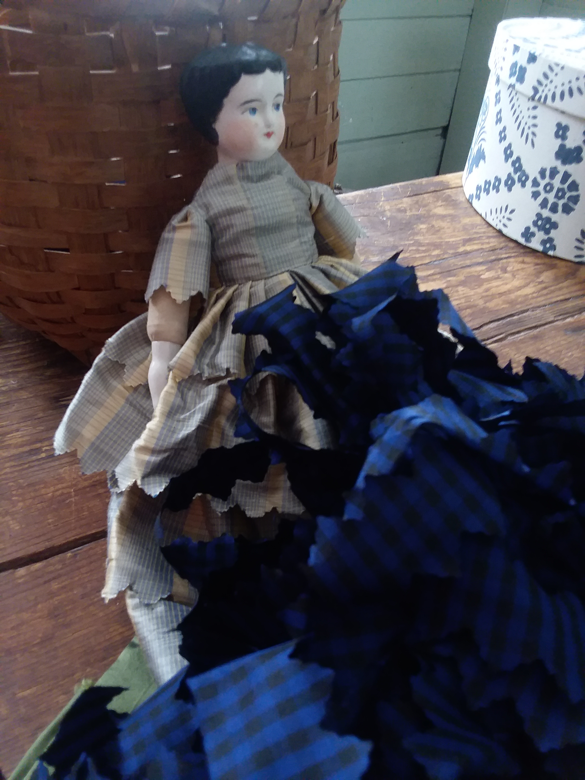 I precut 2+ yards of black silk taffeta to pink first. I made over 20 yards of 2.5 inch and 1 inch black trim. Then I did a few rows of a beautiful pearly blue silk taffeta for a winter hood. Then I finished off with a large piece of black and blue check silk taffeta. I have no idea how much of this there is.