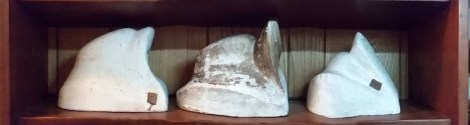 In fact, although I had pictured the smaller bonnet blocks and the hat blocks fitting on this set of shelves…. I was wrong. As you can see this block definitely does not fit. I am just not comfortable with a 150+ year old piece over hanging like that.