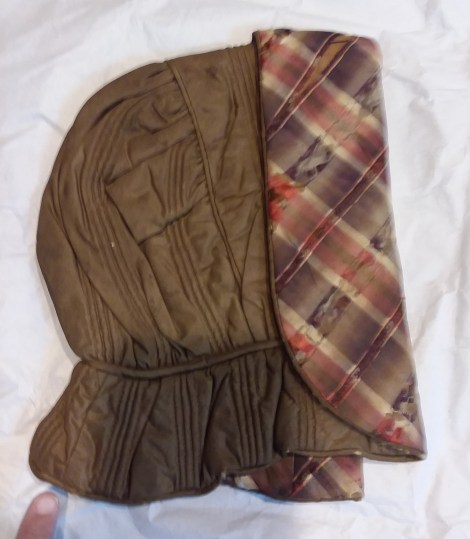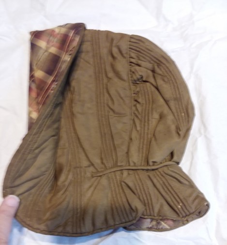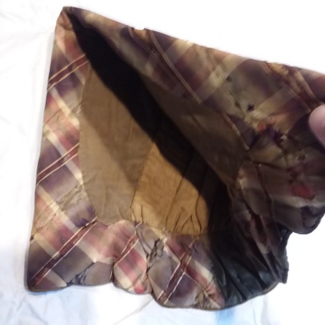 Today’s winter hood is a child’s size, ca 1840s-1880s. The exterior is a solid brown wool. The exterior is quilted with sets of three narrow rows. These narrow channels may have cording in them, tbd. The seam between the crown and brim is piped. The seam connecting the crown and bavolet may have the cord applied on top. I need to look closer. The brim folds back to show a plaid which is constructed from ribbon.