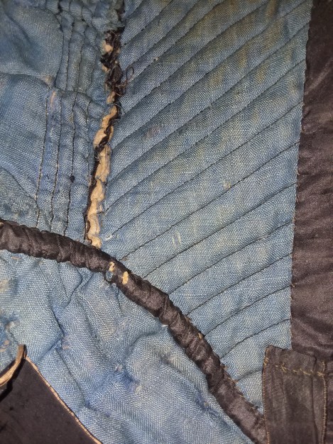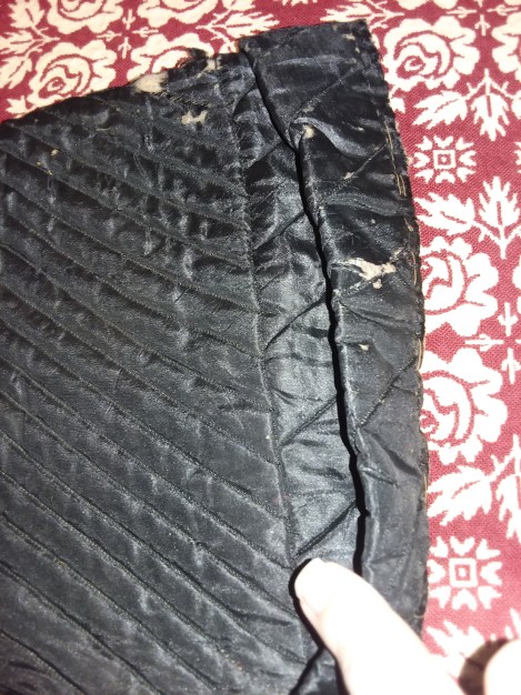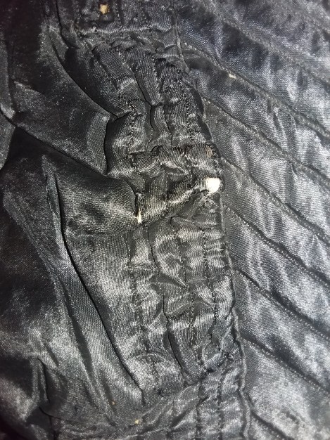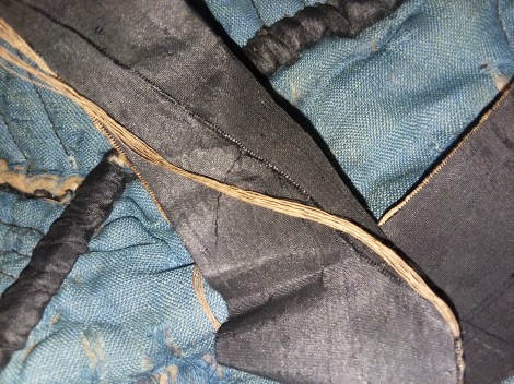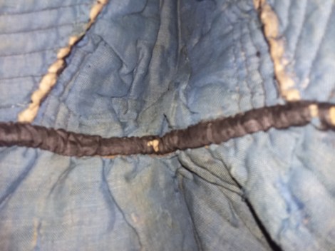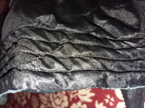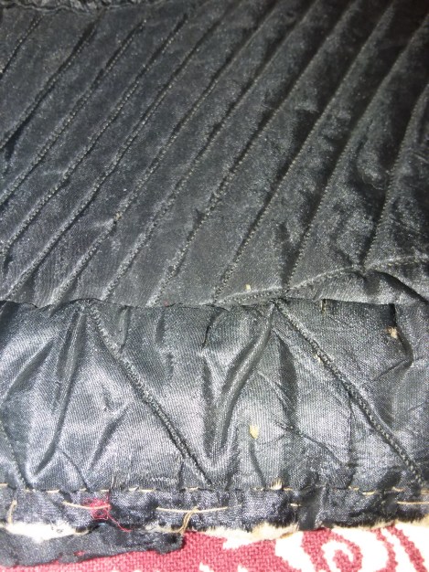 Interior showing hand stitching of silk facing, how the ribbon ties are attached, quilting on lining.