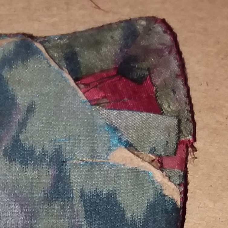 This damaged corner shows a few things. It let me see just how thin the pasteboard is on this piece. I do suggest we use the fairly standard pasteboard most of us have on the backs of notebook. There is a thicker version I like for boxes, but that would actually be too thick for this project. Along the edge of the fragment piece, you can clearly see the whip stitch used for binding the exterior and interior fabrics.