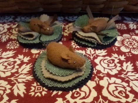 The first batch of mice are the simple partial circles just made really, really, really small. I filled them with local wool batting. Then gave them little faces. The eyes are glass beads, picked to go with their bases. Their ears are tiny thread loops sewn like button loops. They got added to their wool bases I made the other day with a little bit of ribbon.