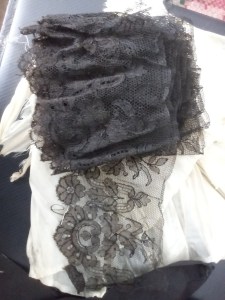 I wanted to reuse the original lace. The pieces belong together. I decided to put it along the edge. This did mean it would cover the pinked edge of the silk. But, it made sense of the deep drop in the silk.