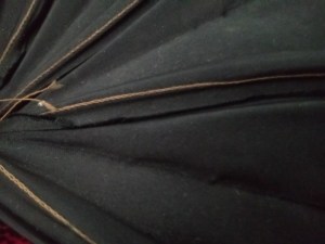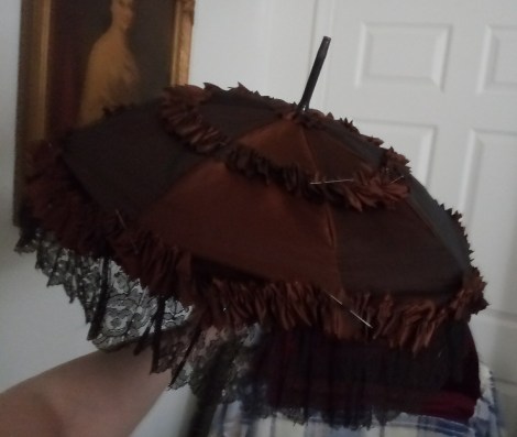 I had been planning to recover this parasol in pink plaid silk. But, I wasn’t able to find enough documentation to satisfy myself. Part of me really wanted to cover it in black as it originally was, but I have another parasol that will be covered in black and I currently do not have black silk taffeta in the house. The stash gave this dark brown option.