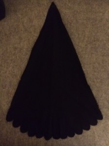 Now that the silk panel was mostly flat, I was able to trace it. The bottom right corner had frayed out a bit. I made tha corner match the other side by folding it in half and copying. I was concerned that it didn’t seem to curve in enough at the bottom. I remembered that line from the parasol covers I drafted years ago. This did turn out to be a factor as I had to go back and take in the bottom four inchs about one-eighth of an inch to get a curve I liked.