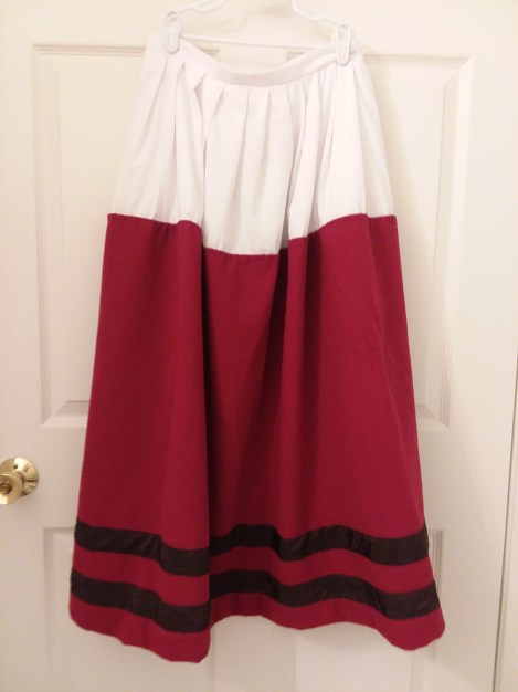 Wool petticoat – This was a project from December. I managed to get two of the stripes of ribbon on in March, each taking a full evening. It is currently on my lap getting set to the waistband.