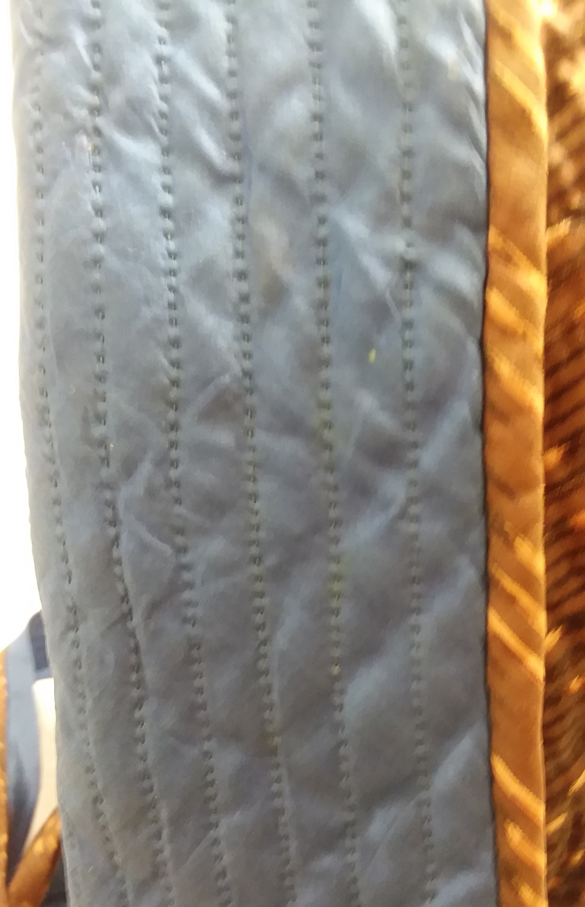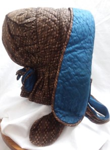 Exterior and interior of the brim fold back. The interior and exterior layers were quilted independently. The exterior was quilted with diagonal rows, while the blue interior was quilted with rows running around the brim. The brim is bound in the brown stripe used for the crown.