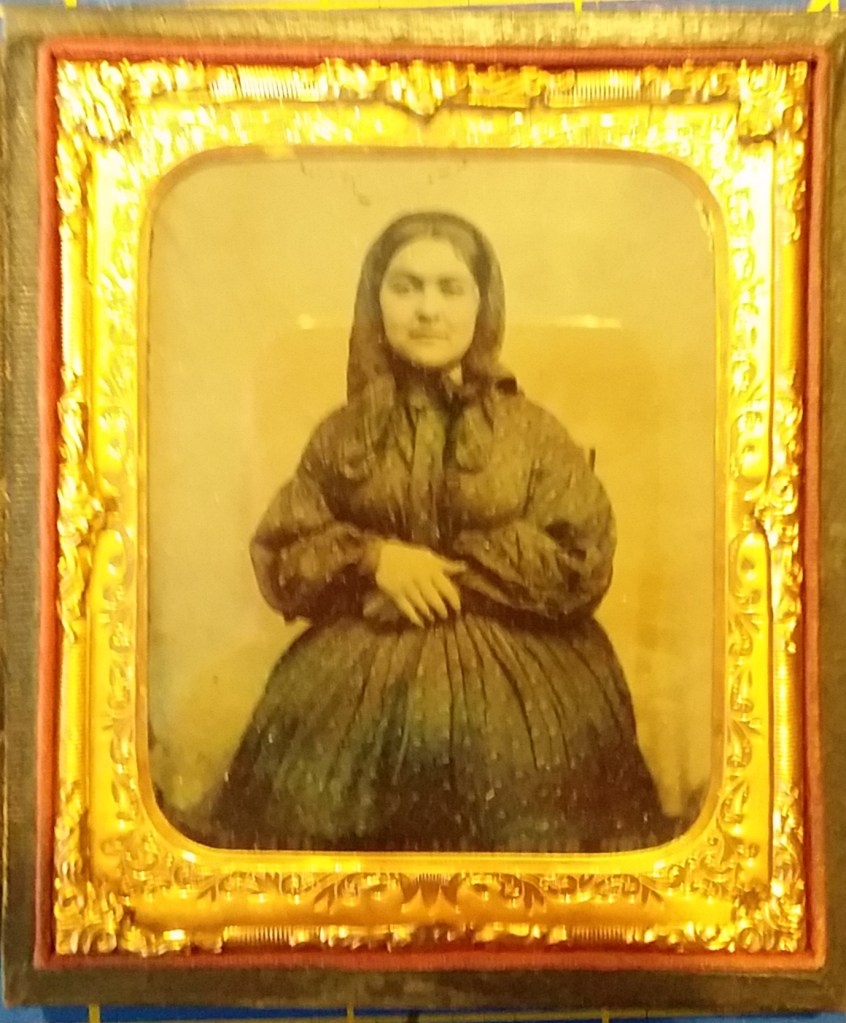 Her hat has a shallow crown, while the brim rolls back. Lacw appears to fall on one side while feathers or a combination cascades from the other.