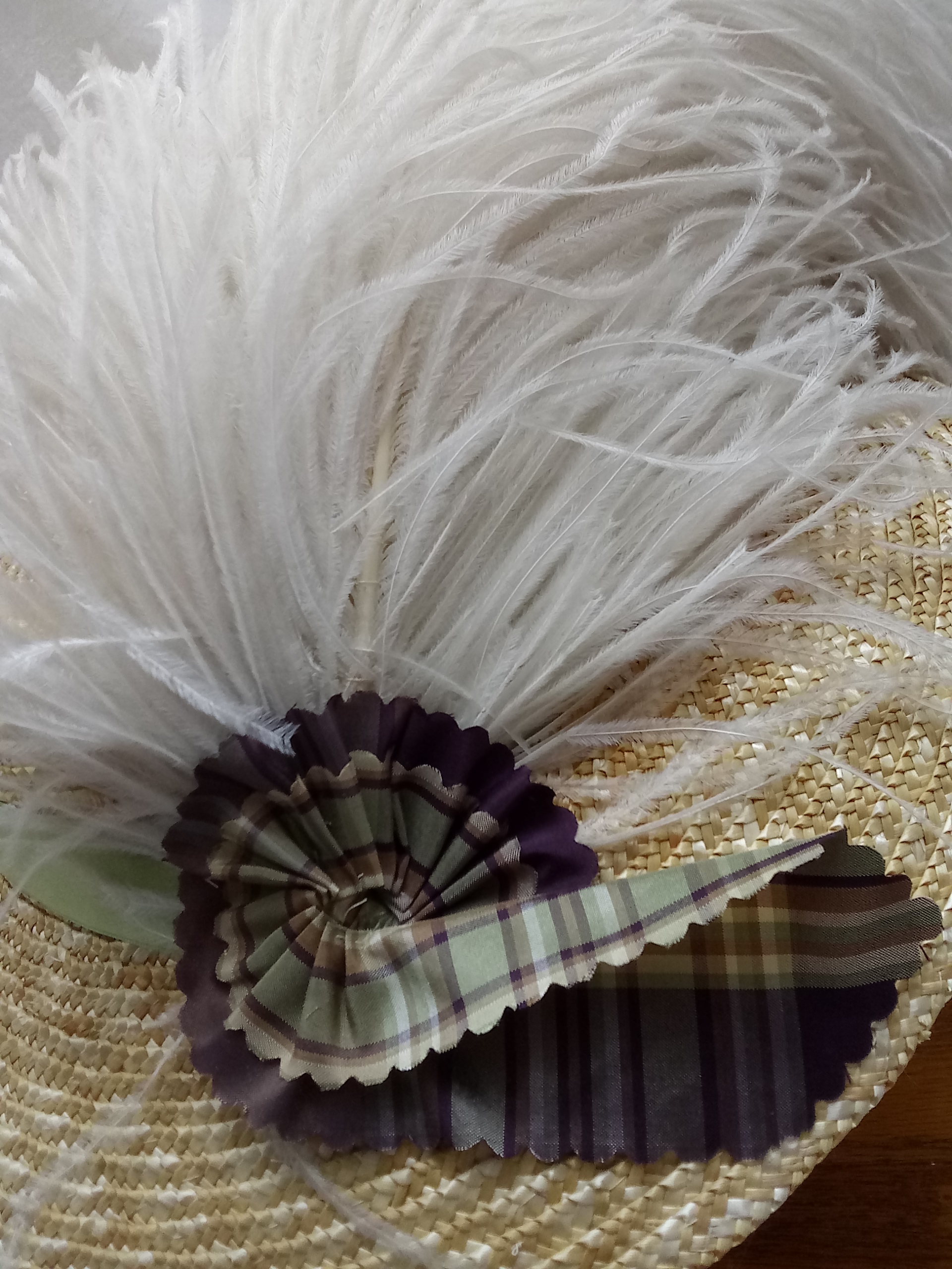 This fashionable tapered crown hat has a slightly wider brim than I usually offer. The underside of the crown is lined with silk taffeta in purples and greens. A green silk ribbon, plaid silk rosette, and an antique plume decorate it. This hat has a 21″ crown. Please check your head measure at the hairline before purchasing. Hat 1 inch to 1.5 inches smaller than your head measure are usually comfortable. The ribbon ties are narrower than I usually use.