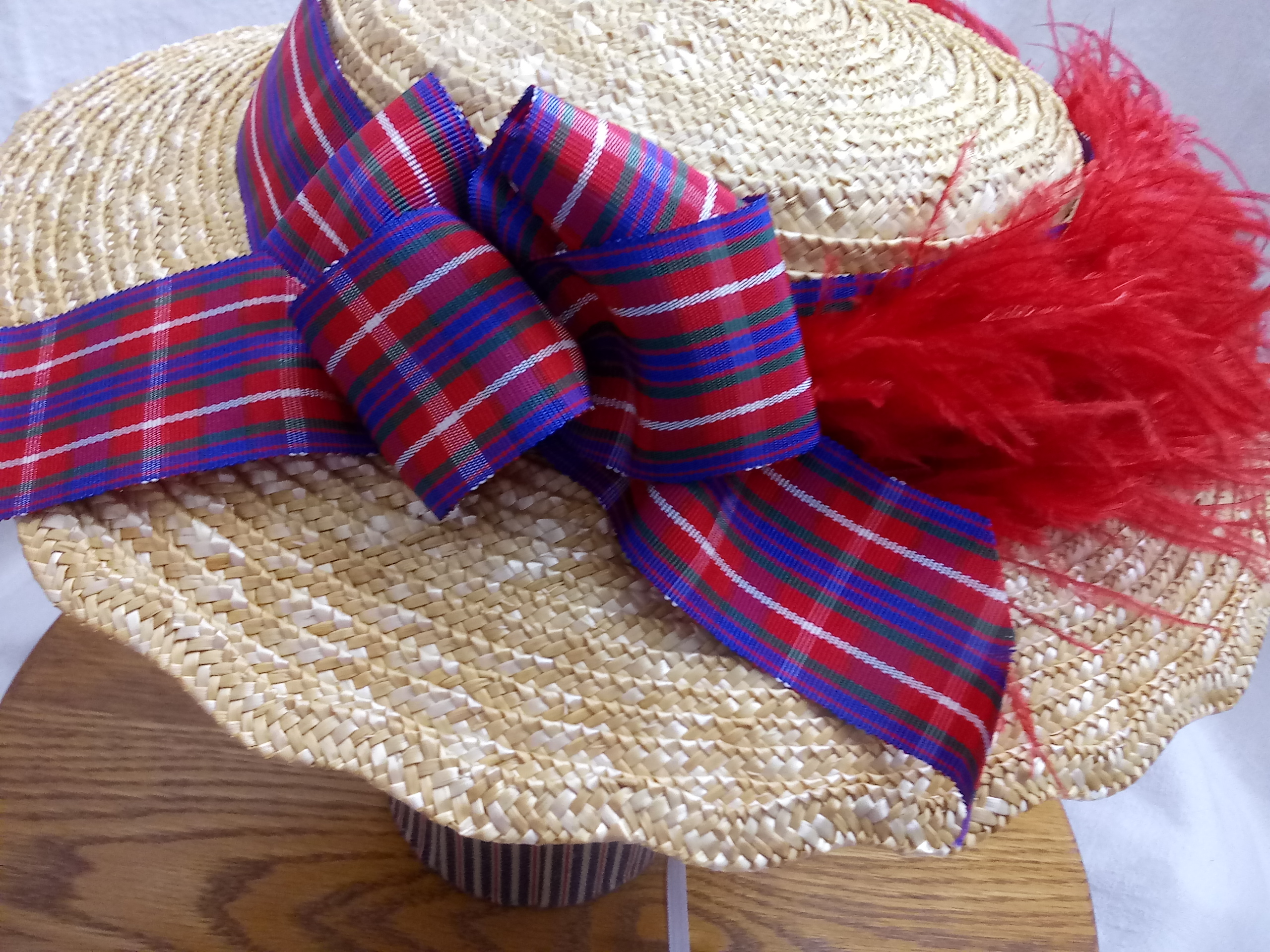 This fashionable tapered crown hat has a pretty scalloped brim. It is trimmed in beautiful red, white, and blue plaid ribbon and a vintage red plume This hat has a 21″ crown. The ribbon ties are narrower than I usually use.
