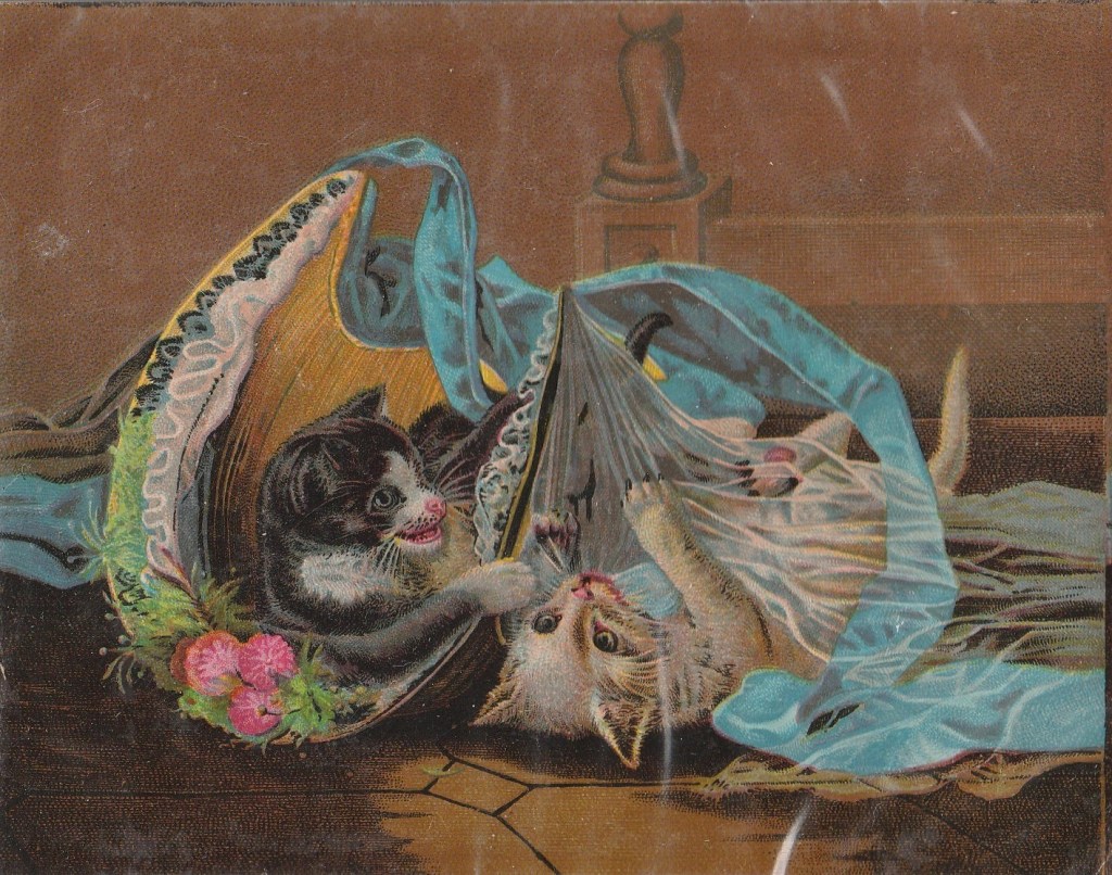 This is a playful image of two kittens playing with a straw bonnet. There is no information on the back or indicating where it is from. I am not an ephemera collector. I simply wanted this because of the straw bonnet, and the kittens.