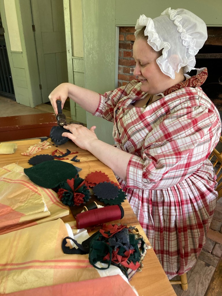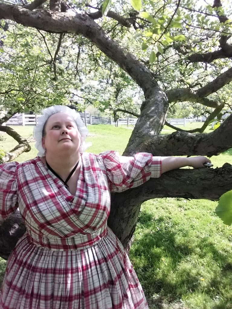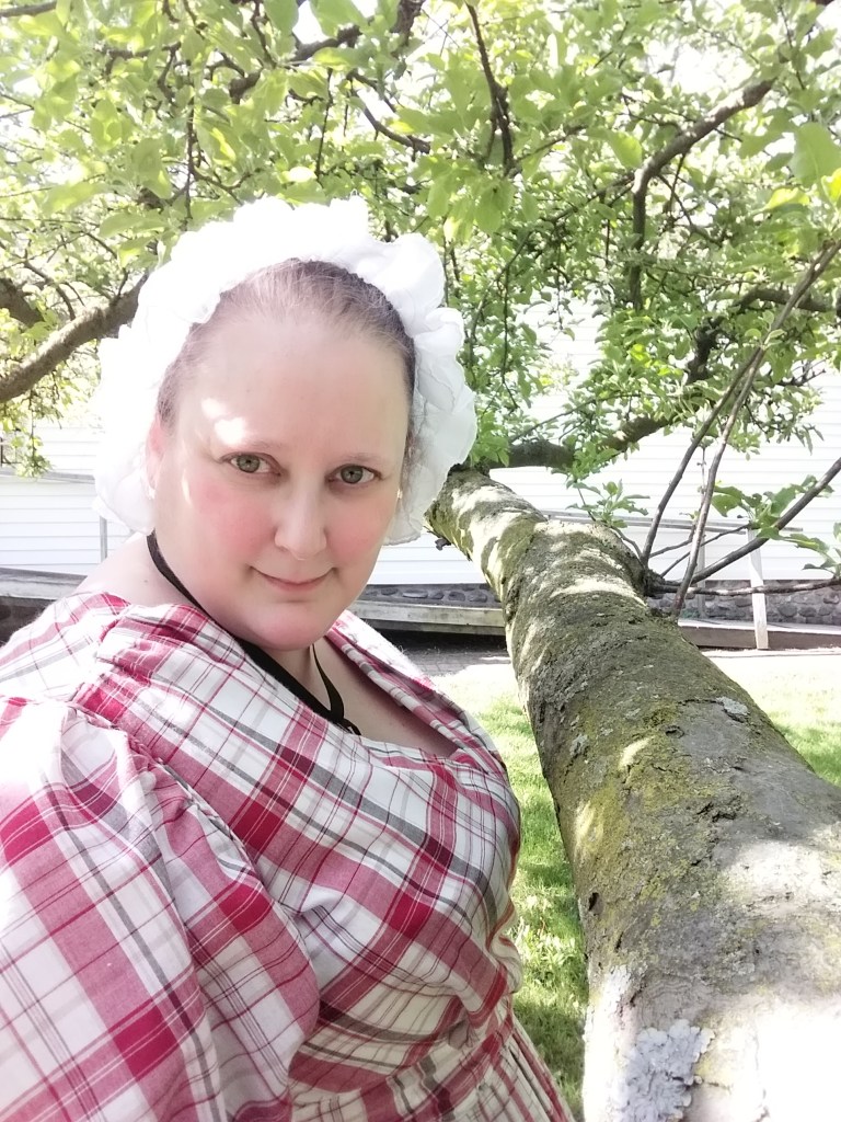 Being asked to do this demonstration during the museum’s Antique Show was a nice nudge to finally make my first 1830s dress. An 1830s dress has been on the to-do list for several years. But, life just kept getting in the way. I am very pleased with how the dress came out as well as the little cap. I still need to make a pelerine. But, I also want a second 1830s dress now. To hear about the details of how this dress went together, take a look at this video.