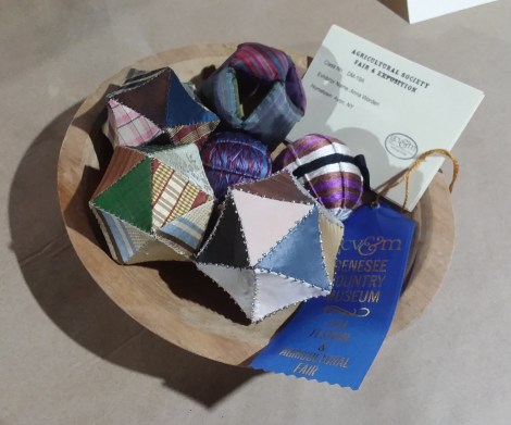 A Bowl of Balls. – Yup. This bowl is truly filled with stress reducing balls. Each one of these are pin balls from the nineteenth century. Each one can be made in a day or in several days if sewing for a short time each evening. The corded ball, (center and 3pm) is they first project I introduced during my lockdown YouTube show. This became such a favorite with people, I offered it as a kit in 2021. These two are made with silk threads left over. The ball at the top is one of my pillow pin balls, the project that became my “recover project” after surgery a few years ago. This project has small amounts of sewing that is gentle on hands that have been injured or are otherwise weak. One pillow at a time keeps you from doing too much. As it turns out, one pillow is all the energy I had most days after school in September. My goal had been to make two or three for the bowl. The last three are my newest pin ball made from paper pieced triangles. This one gives me 5th grade flashbacks.