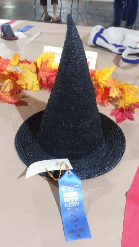 Straw Cone Hat – I was able to talk about women earning money through sewing straw for two events this year: the Civil War Era and Novel Weekends. This often thriving cottage industry gave women the opportunity to support themselves and even their families for much of the nineteenth century. While neither era I demonstrated would have made a conical hat we now attribute to being a witch hat, the skills are much the same. About a year ago, I started wondering if I could pull off making a good cone hat or witch hat. The shape itself wasn’t the challenge, it was the size and the consistency. This summer, I jumped in and gave it a try. I am quite pleased with the cone shape. It is consistent, the hardest challenge, and has a little attitude with its curve. The brim is a little narrow as I ran out of straw. Go figure. I may give it a little decorative edge in the future. The inside is lined with green silk and a little cotton batting, hand quilted of course.