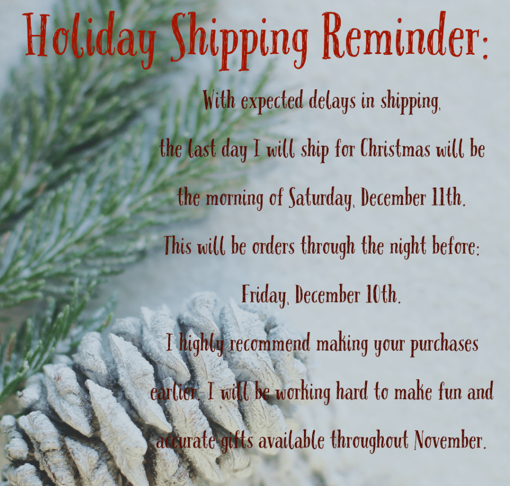 With expected delays in shipping, the last day I will ship for Christmas will be the morning of Saturday, December 11th. This will be orders through the night before: Friday, December 10th. I highly recommend making your purchases earlier. I will be working hard to make fun and accurate gifts available throughout November.