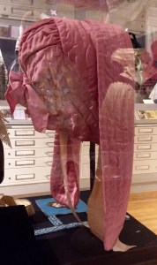 This pink lappet style hood is currently on display at the Genesee Country Village and Museum. It is shown with the brim turned back. You can see how the neck edge of the crown can be drawn up inside for comfort and fit.