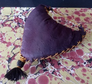 For this 29th day of #historyinherhands , I offer this heart pin cushion in purple silk. This useful heart is made from a pair of triangles under the guidance of the children’s book An American Girl’s Book, by Eliza Leslie. Like many young girl’s projects, pin cushions such as these could be made of materials from the scrap bag and embellished to show the maker’s skill.