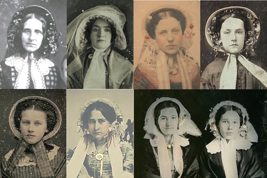 We see greater variety in the angle of which these bonnets are worn, seeing them worn nearly vertical, angled slightly forward and angled slightly backward. The bottom right and bottom left images show the further forward reach of the spoon bonnet while displaying noticeable difference in the depth, angle and shaping of the crown and tip. In the top left and top right images, we can see how the frill aids in holding the bonnet on. Again, the flowers are aiding in securing the bonnet to the head. In the bottom row, third from the left, you can see the woman’s flowers reaching down over the hair line. (The lower right image could be considered as wearing her bonnet quite forward.)