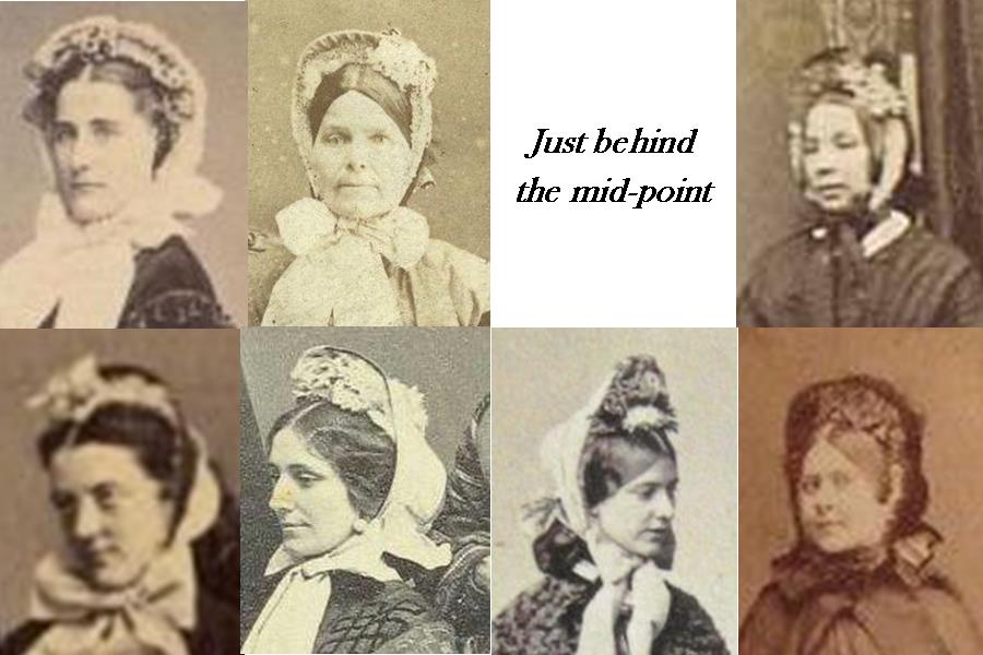 This next group of women are wearing their bonnets at or just forward of their mid-point.