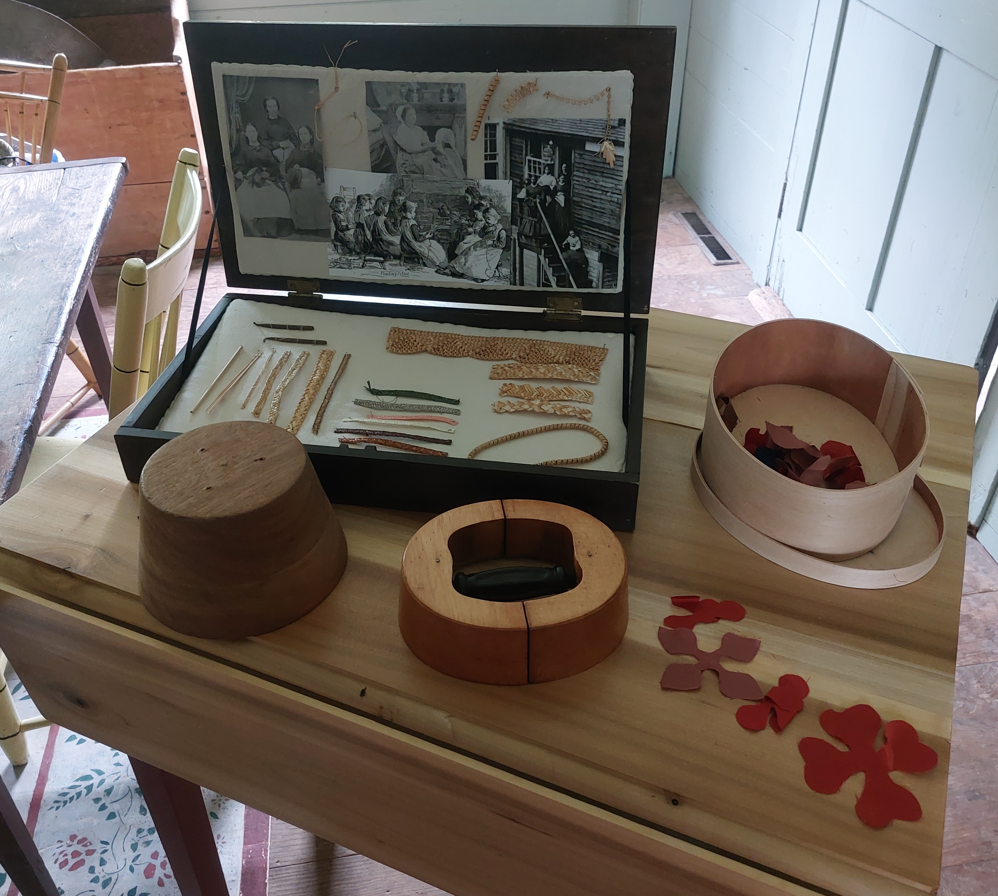 My focus was meant to be on tools of the trade for the day because of the museum’s antique show taking place. With the weather being rainy, I realized the pinkers would not work at all and that negated the storyline of some of the other machines/tools I had in mind. So, I focused on the tools of the cottage industry end of millinery. I am very glad I did because this let me truly focus on that part of the story as it builds into the whole story. The other way around, the women sewing and plaiting at home seems to be lost. As I talked today, the power of a tiny straw splitter really grew for me. The idea that a tiny tool, small enough to disappear in a hand or be lost in the dirt, was the starting point for turning a tubular grass into a durable, lasting pieces of clothing, was wow.