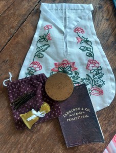 A pocket becomes a story with what it contains inside and in some cases, the style, construction, and state of the pocket itself. In its fullness, I picture presenting visitors with a table of pockets. Each pocket representing a woman in the historic village, filled with items that woman might have carried with her. After describing how a pocket was/is worn, visitors could pick a pocket to examine the contents further. With younger visitors, they could surmise who wore the pocket and, with encouragement, development a story about the person. With adult visitors, discussion can develop based on the items in the pocket, how they were used, their history, etc., or about the woman the pocket represents, their life and/or their job.