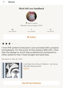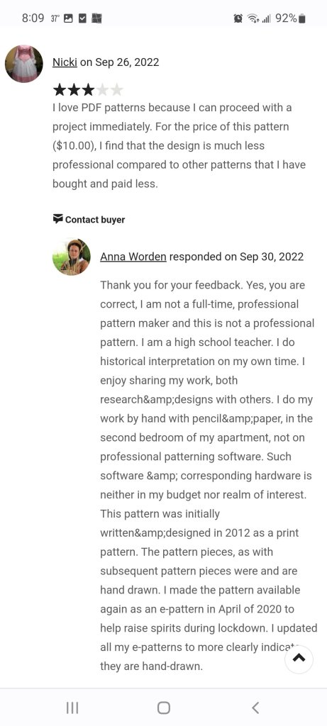 I already have a copy (and intend to make it up soon), else I’d buy it again. I have no idea what this person is talking about in calling your drafts “unprofessional”, and highly doubt that they’re actually finding professional designers selling niche patterns for less than $10. Against retiring it, I’ll also observe that I don’t know of any other fichu patterns of similar currently available.