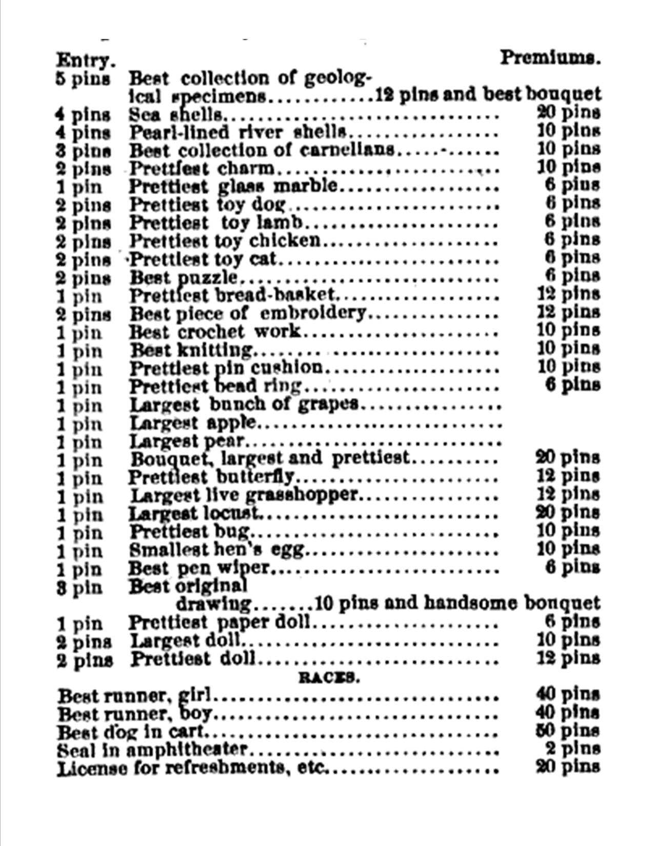 We only sold tickets to children in our neighborhood, because we were afraid we could not control a large crowd, without assistance of the grown folks. The day was pleasant. The tables were covered with beautiful articles tastefully displayed and interspersed with splendid bouquets and wreaths. The most noticable among the premiums awarded to Nettie Guyre, for best embroidery and prettiest doll; to Lizzie Whitman, for best bead basket, best charm; to Charlie Riggs, for best collection of geological specimens, best original drawing, best puzzle, largest bunch of grapes and larges apples; to Lucy Harper, for prettiest toy lamb; to Jennie Gow, for best collection of sea shells and prettiest toy dog; to Minnie Hakes, for prettiest paper doll; to Cornelius Smith, for the best worsted knitting; to Mary Gale, for best bouquet; to Lucy Gow, best pin cushion, best crochet work; to Roddie Riggs, best collection of river shells, largest pear, largest toy chicken; to Clara Whitman, largest glass marble; to Minnie Gow, prettiest bead ring, largest doll, prettiest pen-wiper; to Carrie Conant, largest collection of carnelians; to Harry Carter, best crab apples.