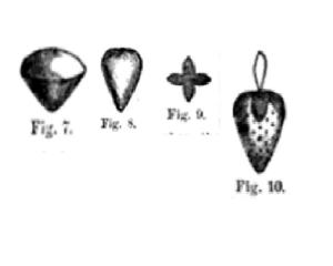 Original strawberries are found in silk, velvet, wool and linen, filled with emery as well as wool and bran. While most are a shade of red, not all are. Some are capped with green fabric leaves either of fabric or embroidery floss, while some are topped with metal caps that occasionally reflect the look of leaves. Here are three strawberries in my collection. Notice how the red and white strawberries each have tiny dots resembling seeds. This seeded look could be accomplished with beads, embroidery, or paint.
