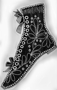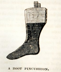 This is an example of a boot shaped pin cushion in my collection. Boots and stocking were fairly common shapes used for making pin cushions and needle-books during the Victorian Era.