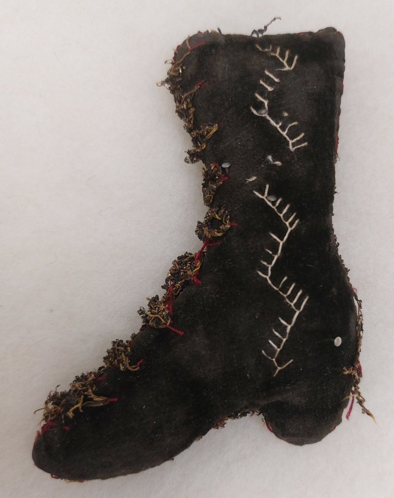 A few pins remain in the cushion. The placement suggests pins may (or may not) have been used to accent the decorative trim in two ways. A pin remains placed inside a lacing loop hints at the possibility pins were placed to mimic the look of boot/shoe buttons. Two pins remain on the “front” of the boot tucked into the embroidery at the vertices of the Vs