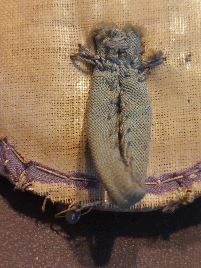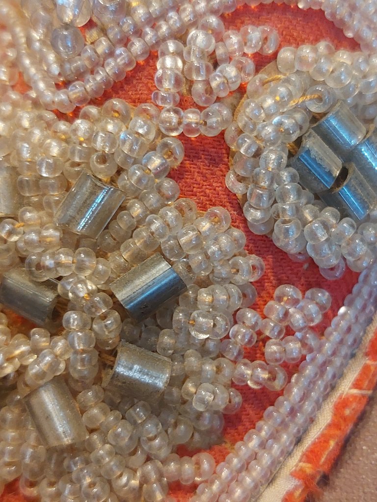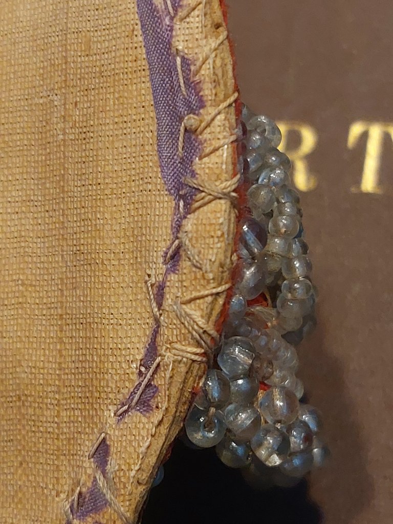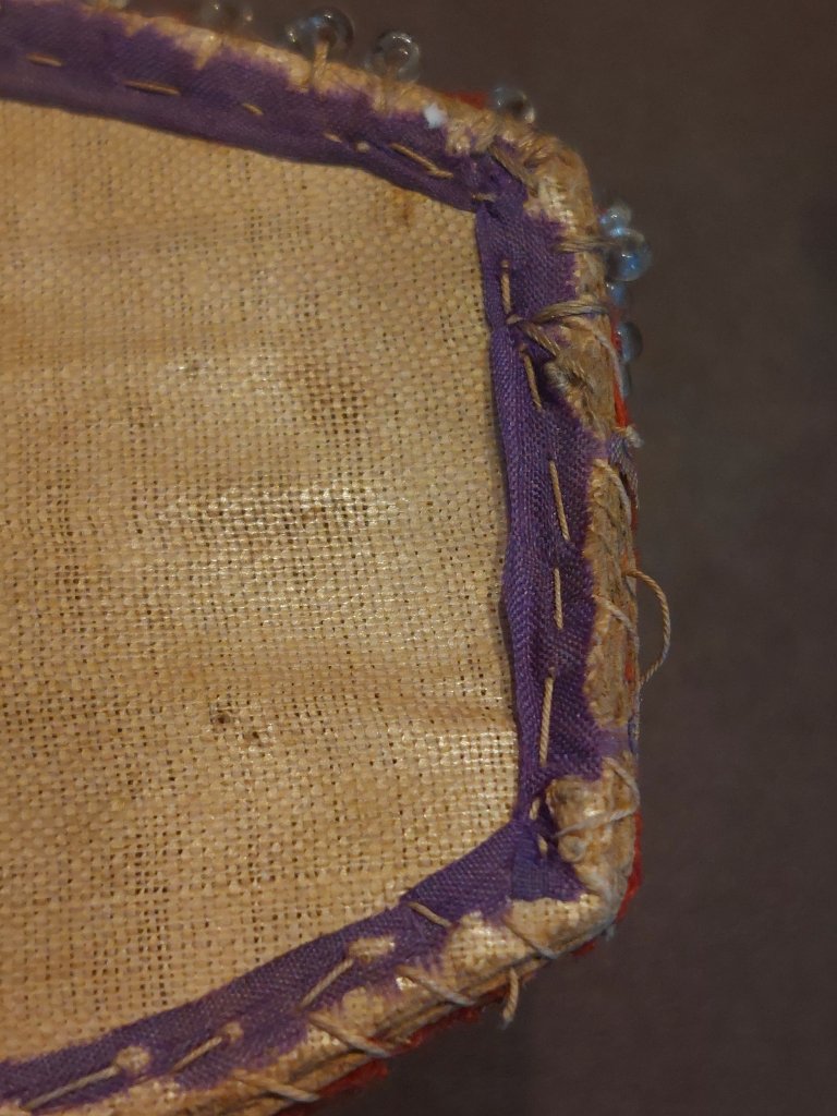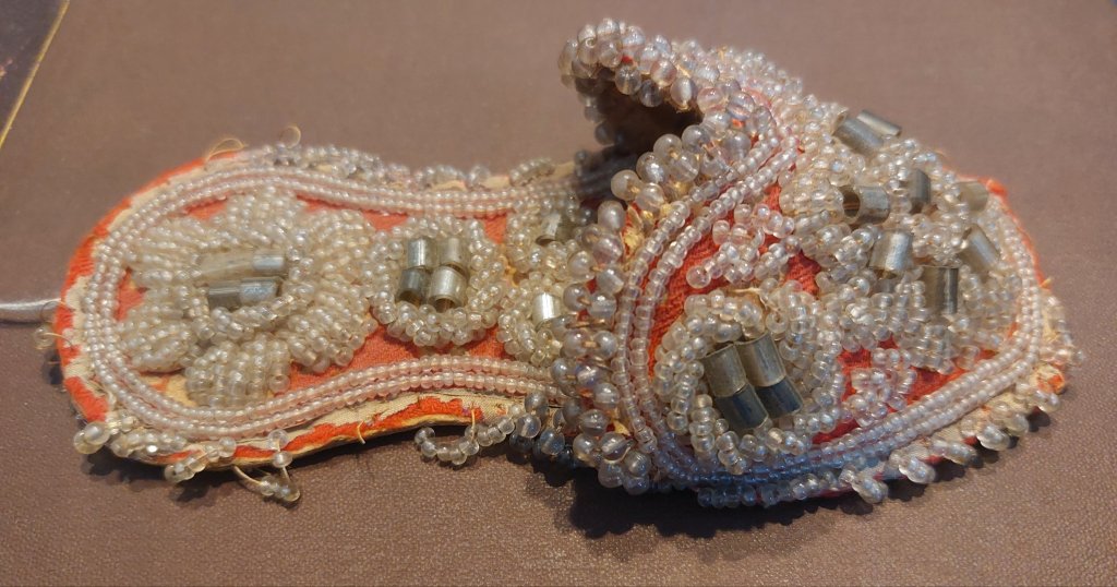 The beaded slipper is most likely a local Haudenosaunee (Iroquois) piece, though ladies magazines did try to mimic the look. At first, I thought the red base fabric was a silk twill. After taking closer photos, I think it is wool, maybe a wool/silk blend.