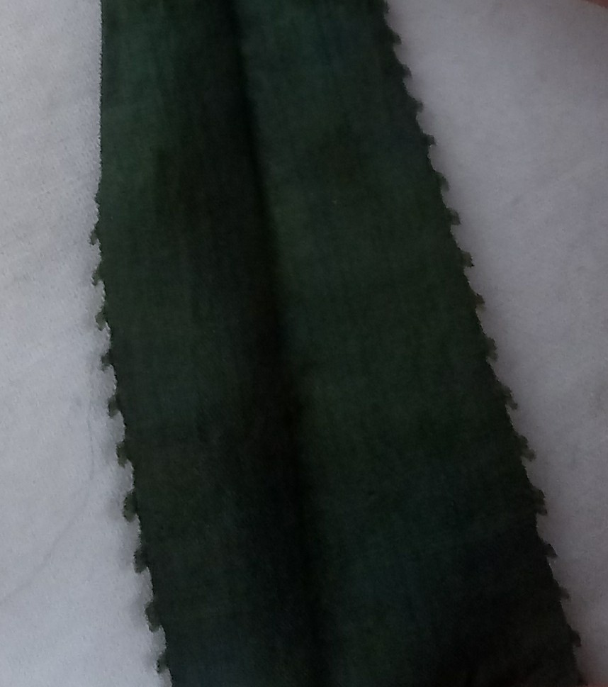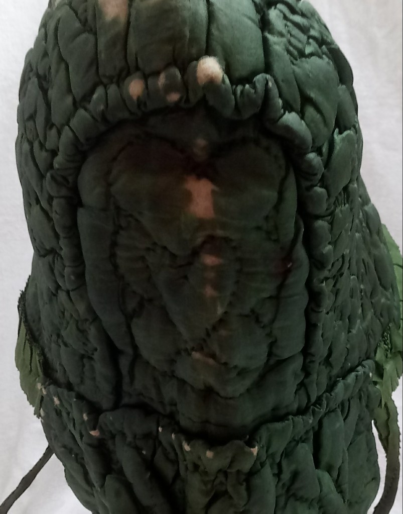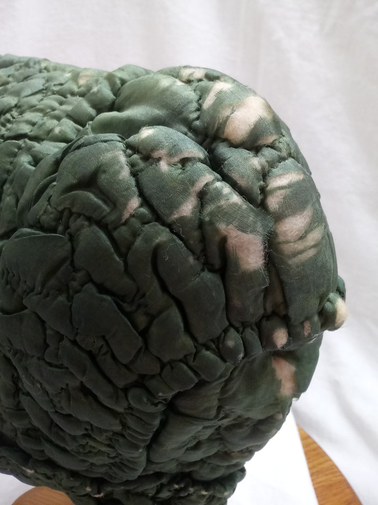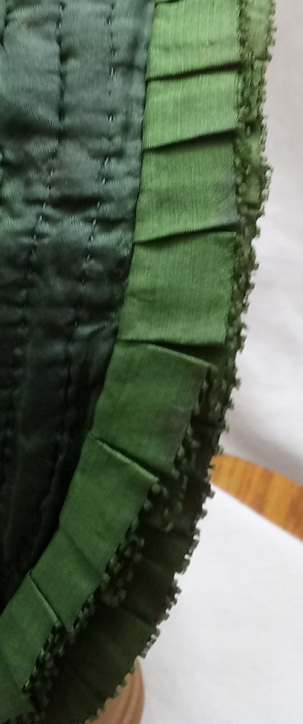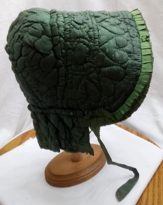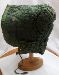 This child’s winter hood is quilted is a sweet heart motif. Hearts circle the brim and center the back of the crown, while scallops fill the bavolet and a double circle motif finish the brim. The green silk taffeta is nearly tissue taffeta soft. While not being overly dry, it has numerous wear spots from storage the pink interior is a medium weight solid cotton.