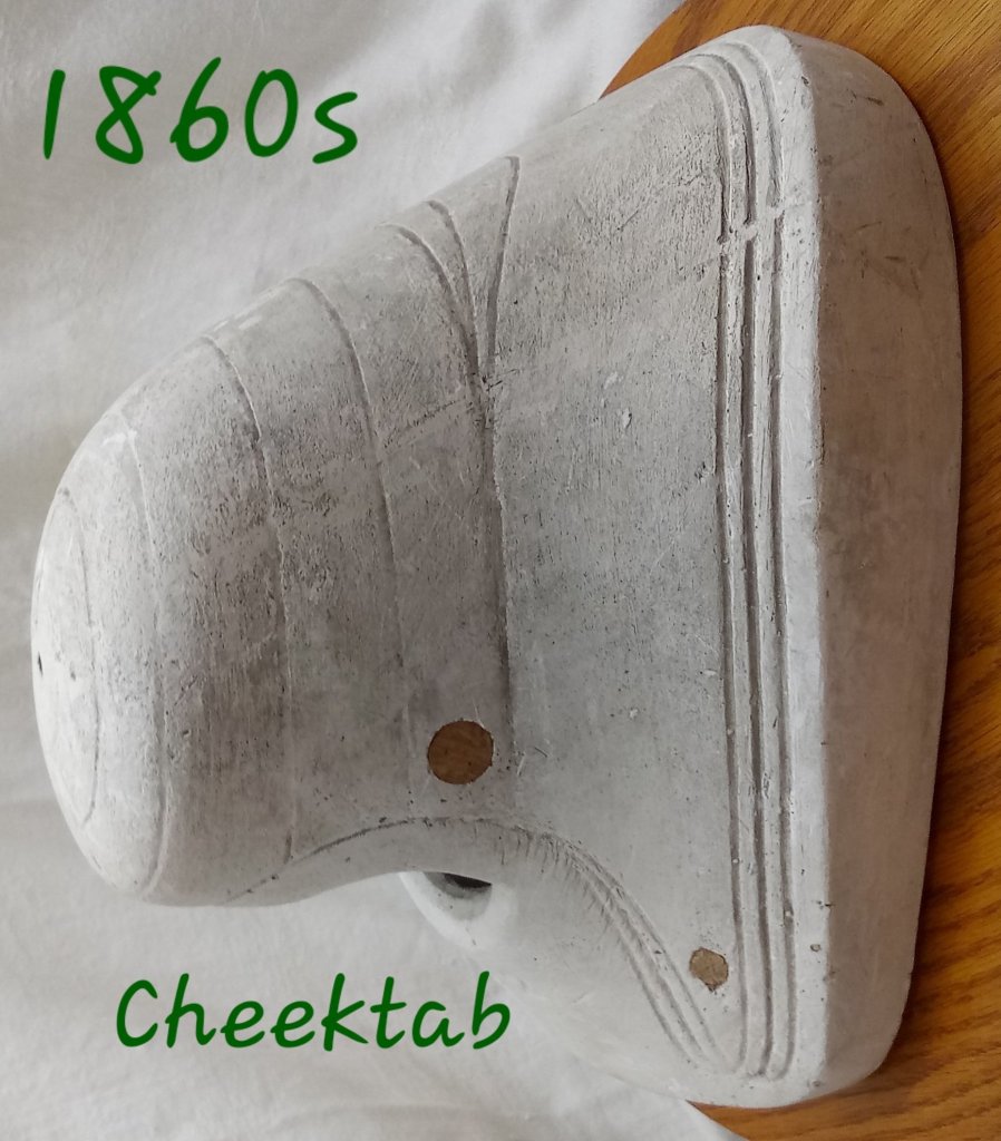 The cheektabs are the part of the bonnet on each side that extend down from the brim. As the 1840s progressed, these became elongated. They continued to thin or narrow in the early 1850s. By the mid 1850s, cheektabs were several inches long and narrow. This continued through the first half of the 1860s. Cheektabs took two primary shapes: either narrow and curvey with a twist or triangular.
