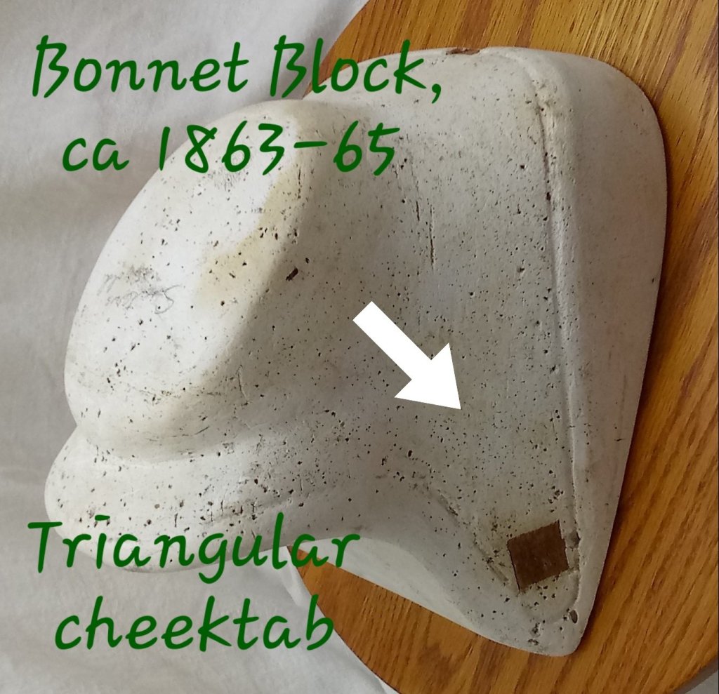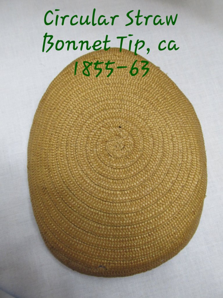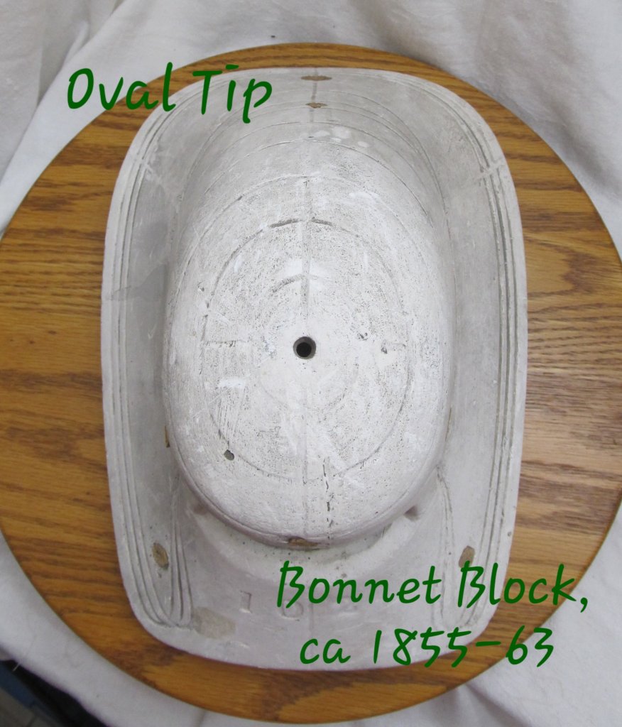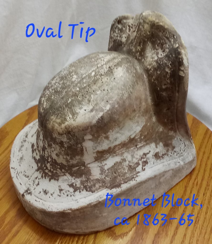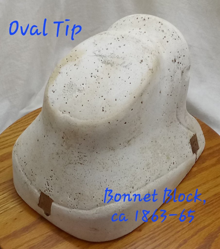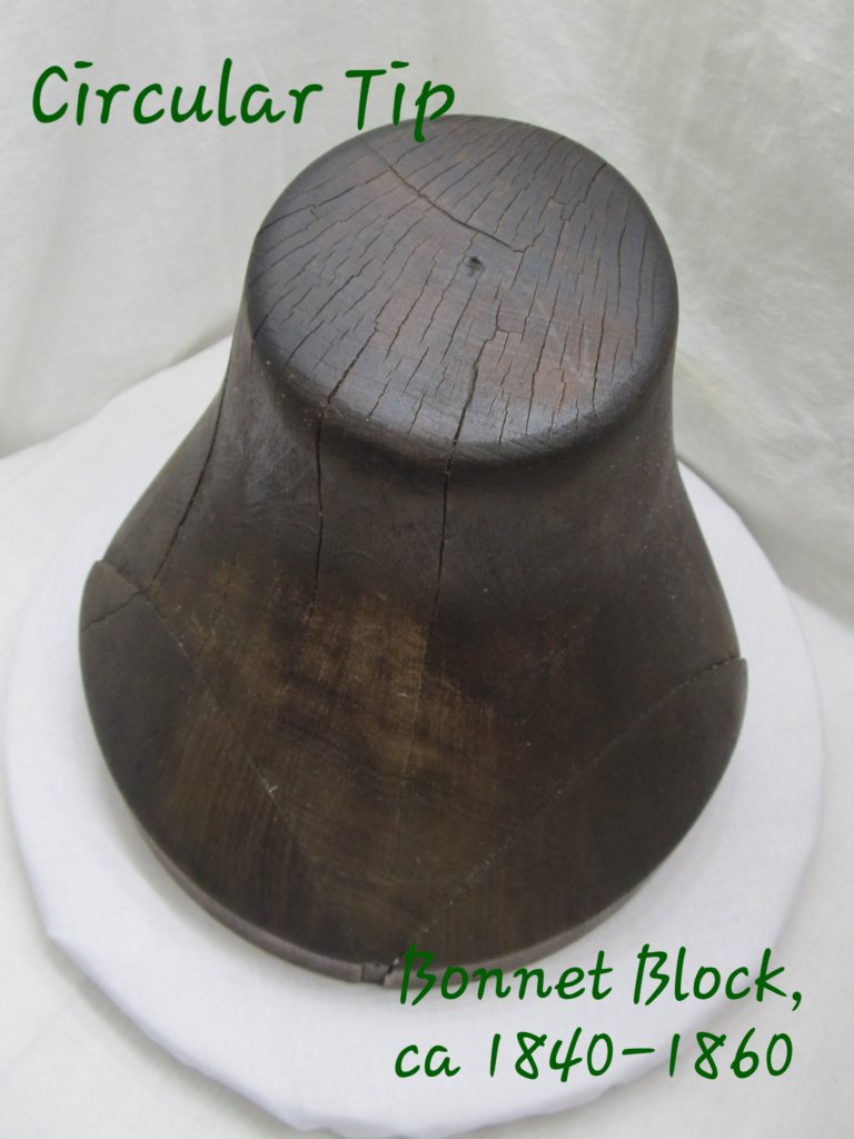 The tip is the back part of the crown that sits on the back of your head. For the 1840s through the first half of the 1860s, the tip is round, either a circle or an oval. The circular or oval tip is consistent in extant bonnets and millinery blocks:
