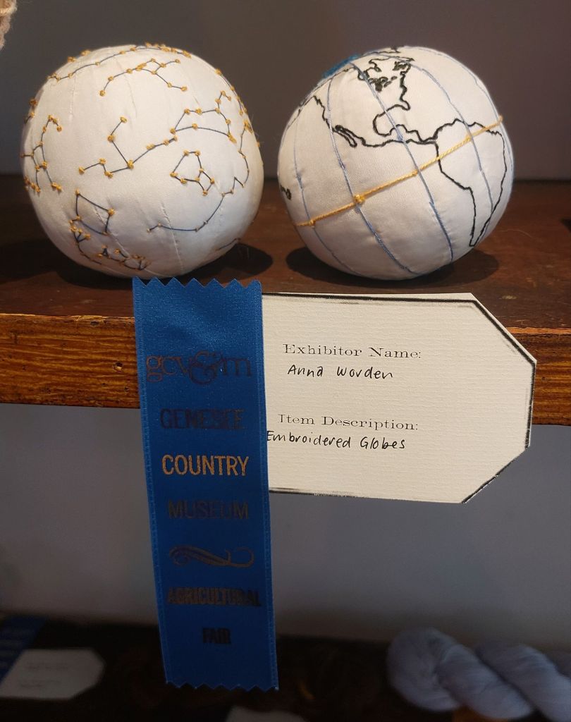The embroidered globes were my Eclipse Festival project in April. I did not expect a ribbon for these. They use only an outline stitch and knots. They were much harder than I thought they would be. Stitching on a sphere is far different from on a single fabric on a hoop or even on a mostly soft surface, like when I embroider the binding of a sewing case. This was silk over linen over wool. Going over the seam areas meant having to skim the silk or catching and getting stuck in 8 layers. I did bleed on the celestial one when I was nearly done. Luckily, I was able to get it out.
