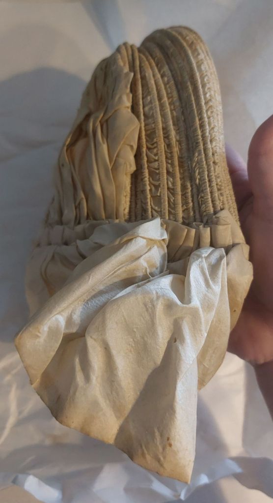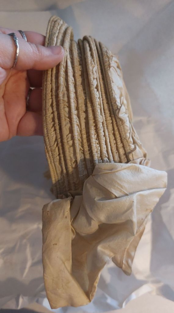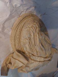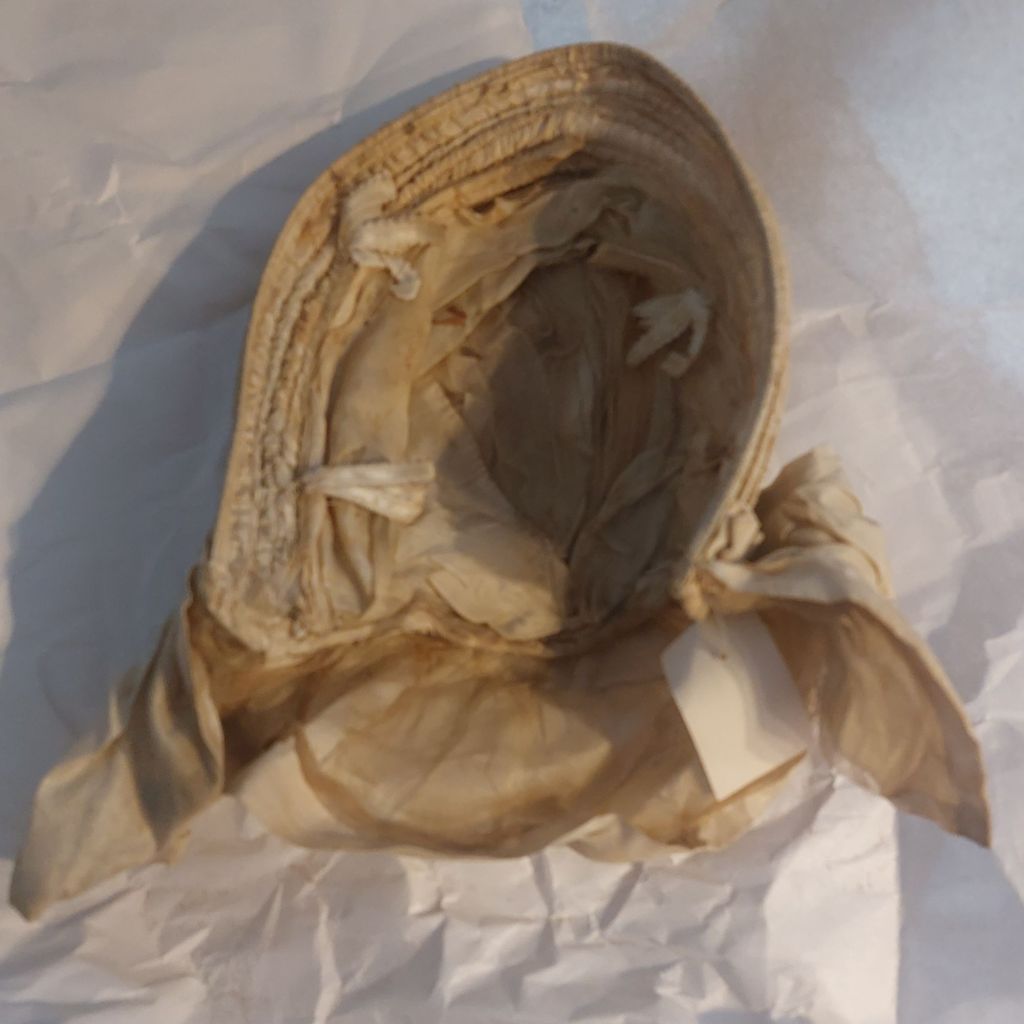 Conservation plans: Slowly restore depth with support with archival tissue. Hopefully, I have enough archival foam left from straw bonnets to make a small support for this bonnet. Relay the shifted layers. Re-gather the crown lining. Re-tack the loose section of the band inside the brim.