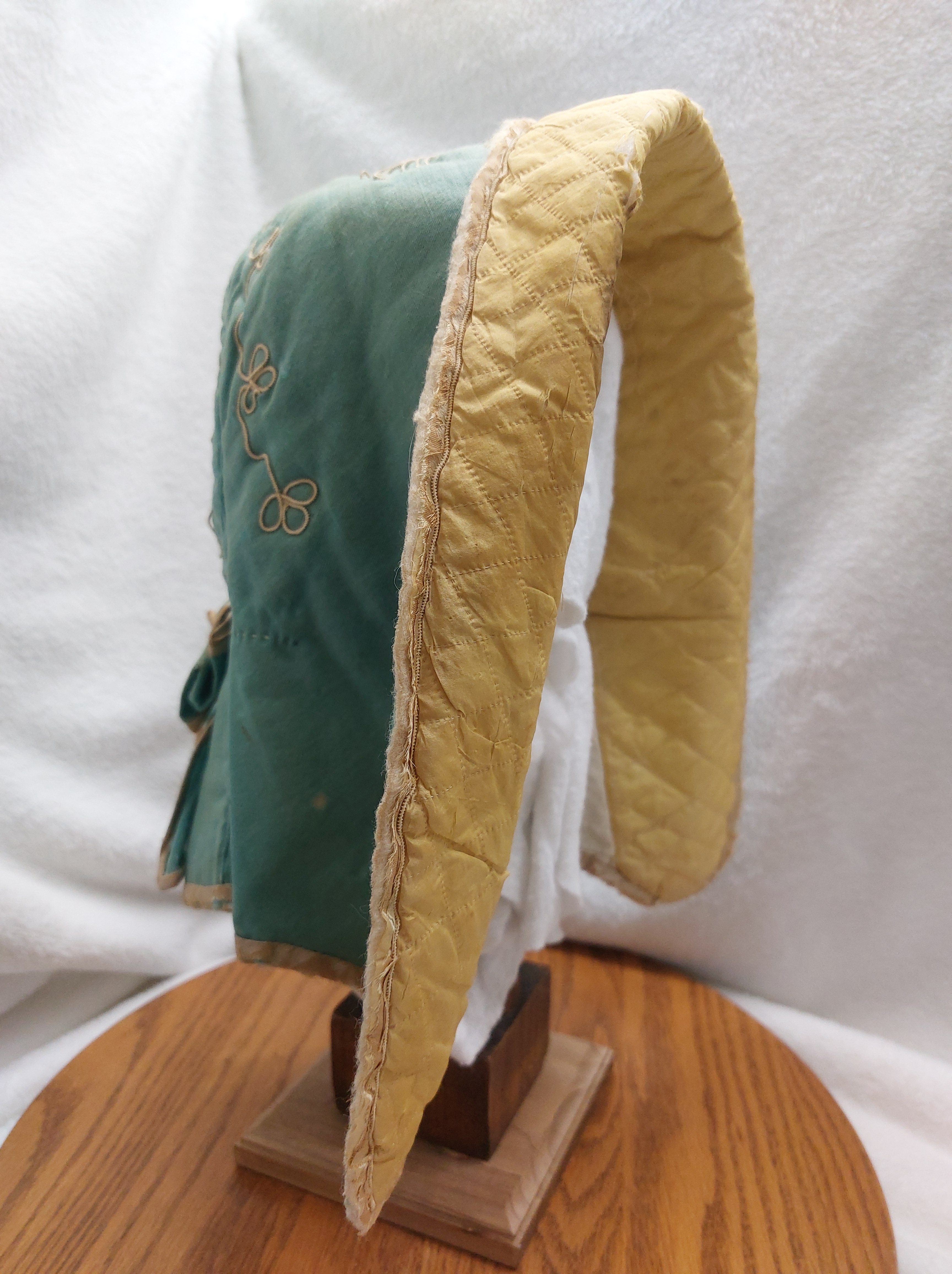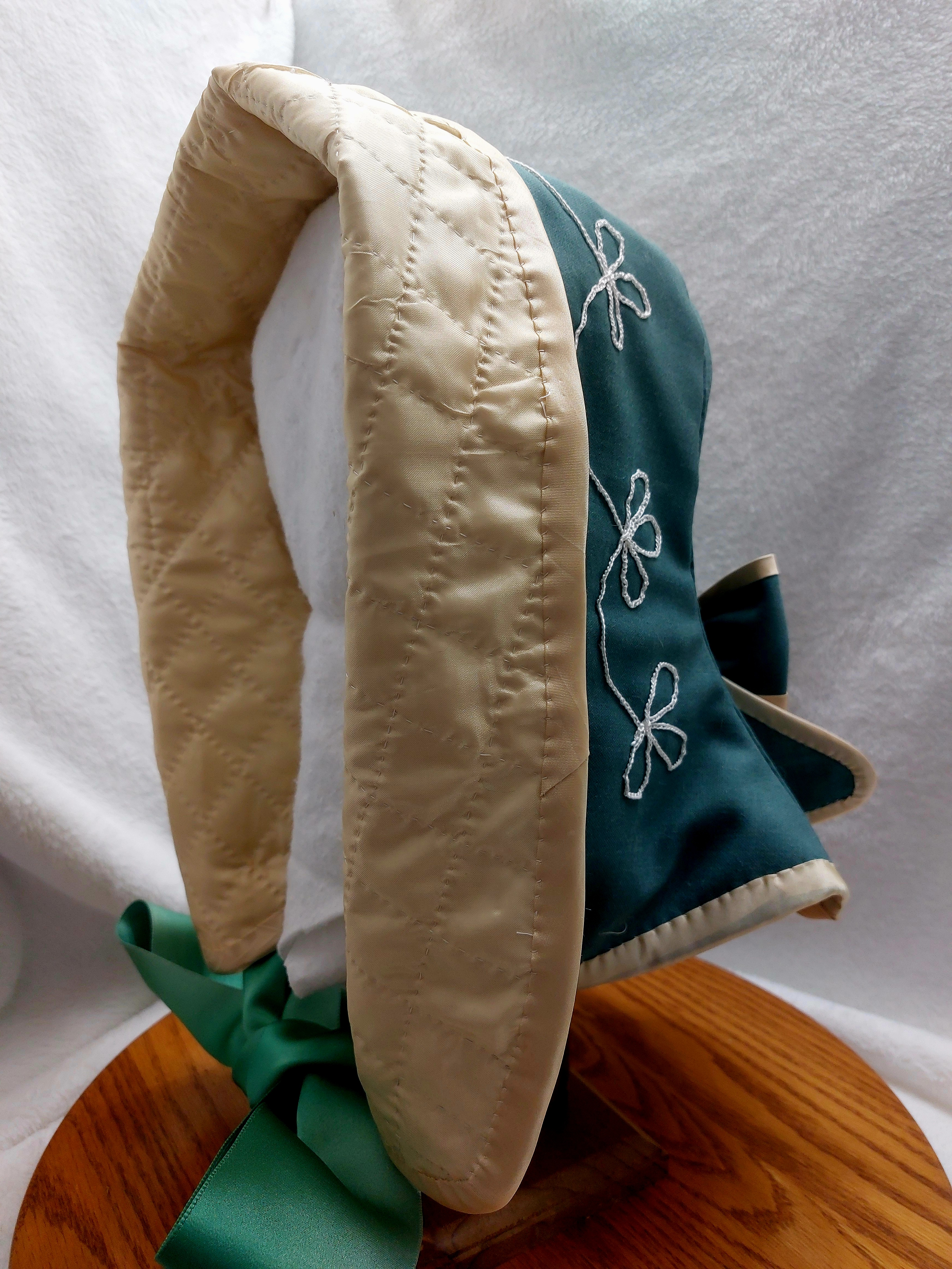 The person who made this original hood from which I pulled this pattern, was skilled creating a simply beautiful hood. The easy two-piece construction has lovely lines with a flare into the bavolet along with finishing details that are just darling.