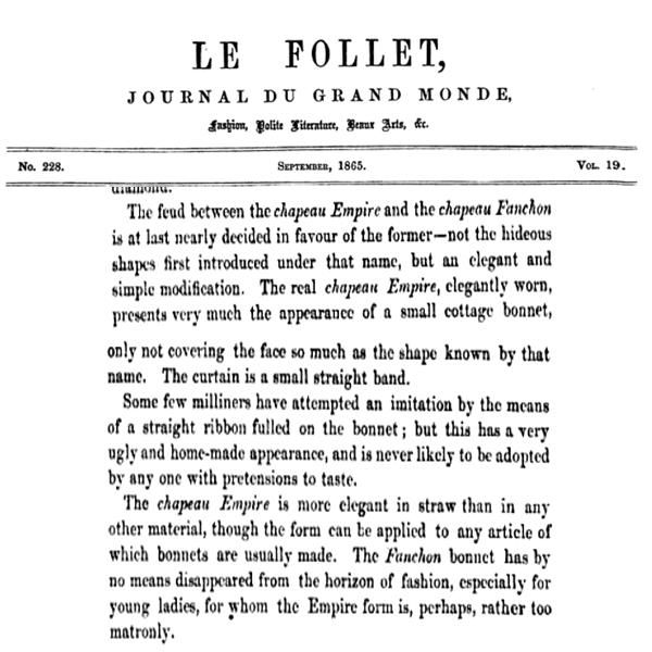 Driving into work the other morning, I was thinking about late 1860s hats when it occurred to me I hadn’t tried the late 1860s fanchon since acquiring the mid-1860s bonnet blocks. These bonnets, sometimes called “half bonnets” in museum collections, have been something of an enigma since I started working with straw. They are an odd, sorta two-sided, sorta three-sided shape that cups the back top of the head. In straw, they are often this base shape, or a variation of this base shape, with a plain plait or decorative plait wrapping around the edge. It is entirely possible, more likely probable, that many of these were cut down from straw bonnets of previous seasons as the styles shrunk.